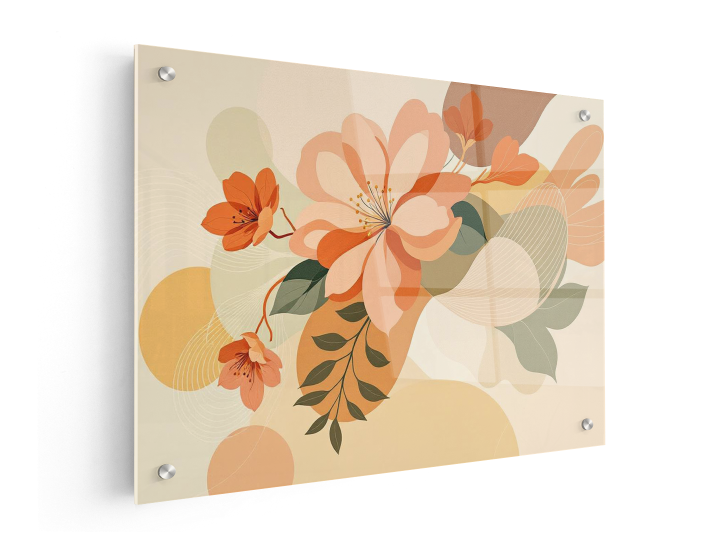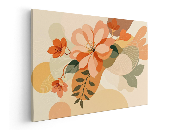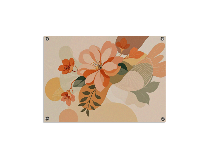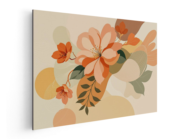 Een botanisch kunstwerk waarin bloemen en planten versmelten met organische geometrische vormen, kleurenpalet van terracotta, olijfgroen en crème, minimalistische achtergrond met zachte lijnen, modern design, premium uitstraling, ultra high resolution.