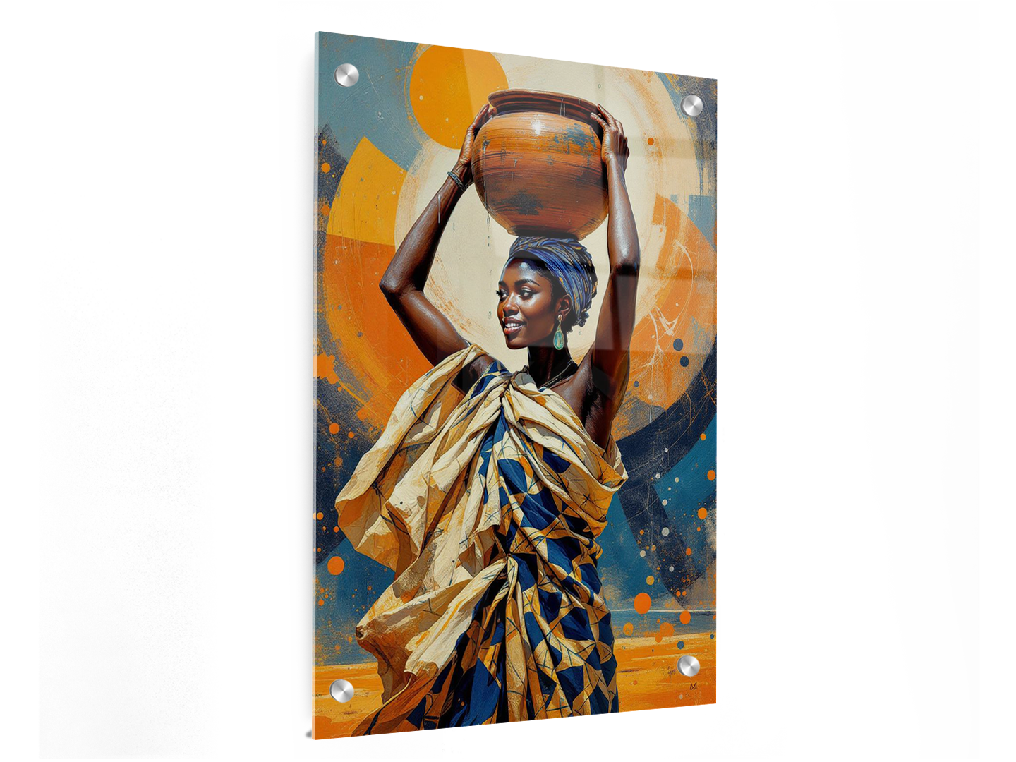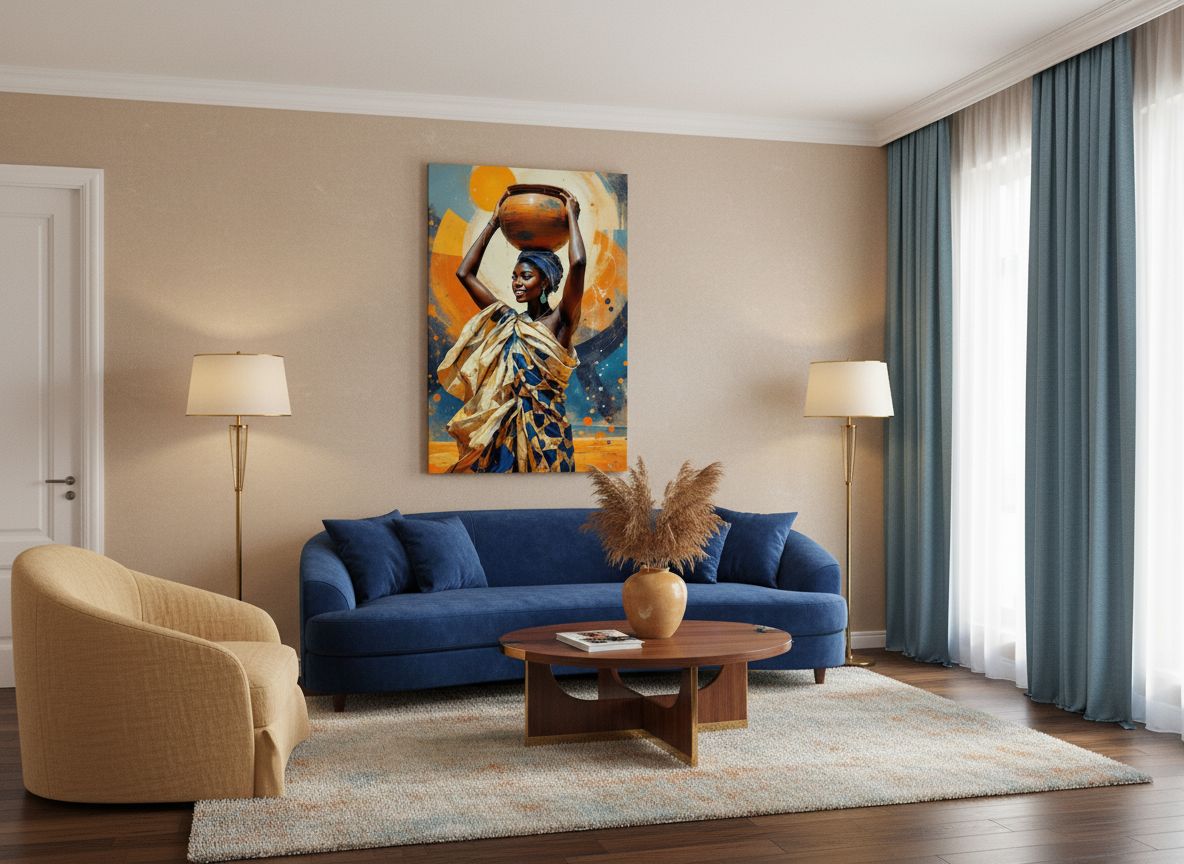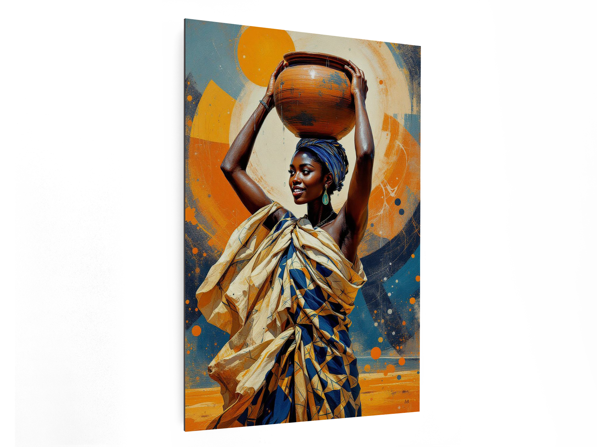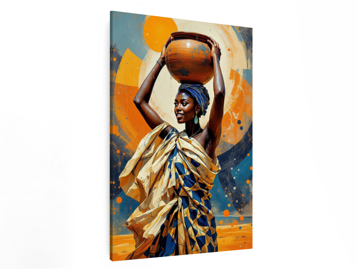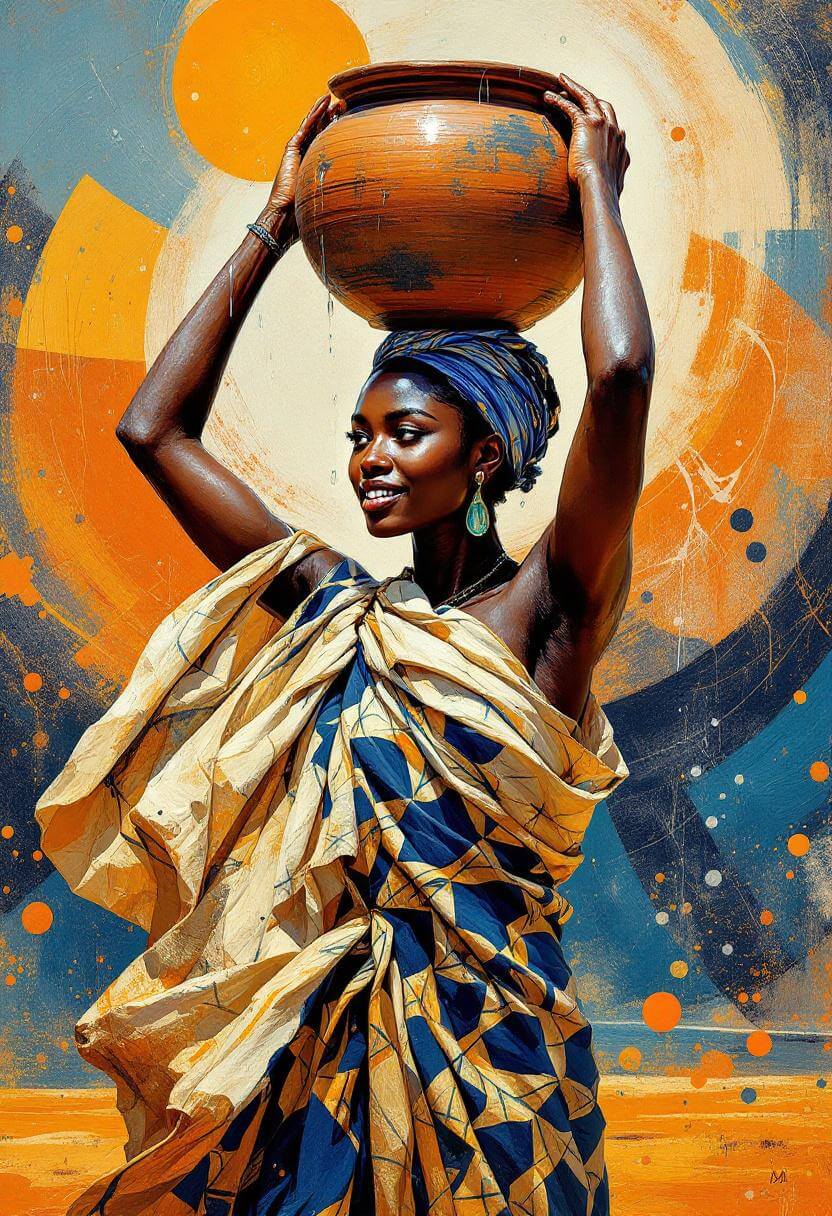 Een levendig en charmant portret van een Afrikaanse vrouw die een met water gevulde aardewerken pot op haar hoofd draagt, waaruit het water zachtjes spat, met een abstracte achtergrond in aardse kleuren, ongelooflijke details en een hoge kwaliteit.