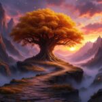 Een epische scene van een avontuurlijk fantasie landschap, met in de verte een gigantische goud kleurige boom, omringd door bergen en wild landschap, met maar een enkel pad die door een bergpas die naar de boom leid, een aantal losse goud kleurige blaadjes waaien door de lucht, met een zon ondergang achter de bergen die de lucht in een mysterische rood / paarse kleur maakt, met wat laag hangende mist rondom de boom.