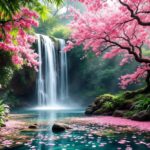 A beautiful and serene landscape with a waterfall that pours water in a lake, create a oasis of tranquility, with a cherry blossom tree and the cherry blossom paddles floating on the water surface