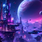 Een cyberpunk landschap van een zwevende futuristische stad in de diepe ruimte, met rondzwevende asteroĆÆden en een planeet op de verre achtergrond.