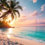 A beautiful hidden beach, within a cove, with beautiful turquoise colored water, and palm trees on the beach, with the sun rise above the horizon, creating beautiful colors in the sky
