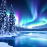 A beautiful snow landscape, with a frozen lake and snow covered trees, with aurora lights in the sky
