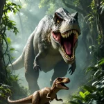 Prompt: Een T-Rex die een Velociraptor achtervolgt in een junglelandschap, epische en dramatische scène, waanzinnige details