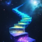 Een surrealistisch beeld van een trap gemaakt van prachtig gekleurd gesteente in het midden van de diepe ruimte.