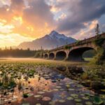 Een prachtige foto van een uitgestrekt moeraslandschap tijdens het gouden uur. Het moeras is gevuld met waterlelies en een oude, verlaten betonnen brug overspant het water. In de verte is een bos te zien, met prachtige wolken en bergen.