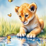 Een prachtig pastel en aquarel portret van een leeuwen welpje, die naar zijn reflectie kijkt in een plas water, met een paar vlinders in de achtergrond.