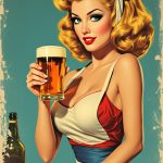 een vintage pop-art pin-up vrouw die een biertje serveert