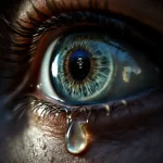 Een hyperrealistische close-up van een doodsbang oog, met een traan in de hoek en de weerspiegeling van een doodshoofd in het oog.