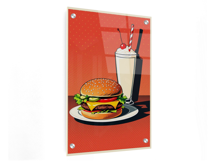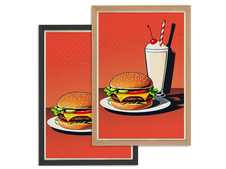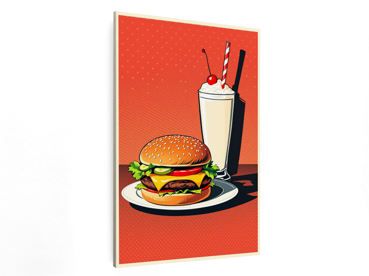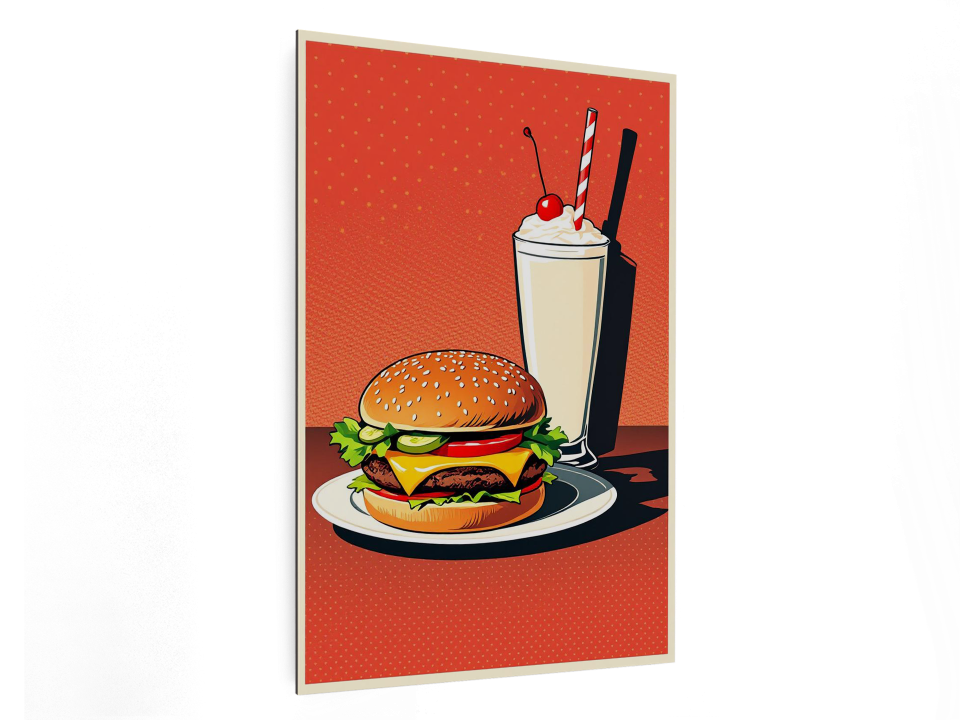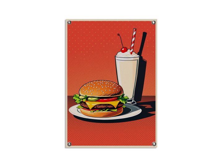 Illustratie voor een diner reclame uit de jaren 50: een klassieke cheeseburger en een grote milkshake met een gestreept rietje, een achtergrond met stippen in rood en crème, sterke schaduwen, vlakke kleuren, vintage fastfood poster stijl, commerciële kunst uit het midden van de vorige eeuw, eenvoudige vormen, hoog contrast, printkwaliteit.