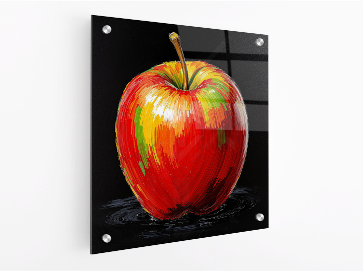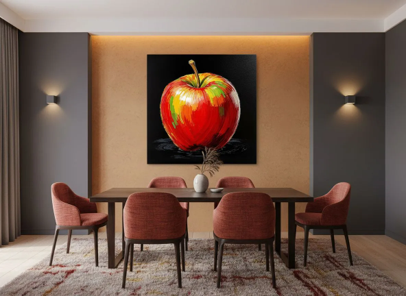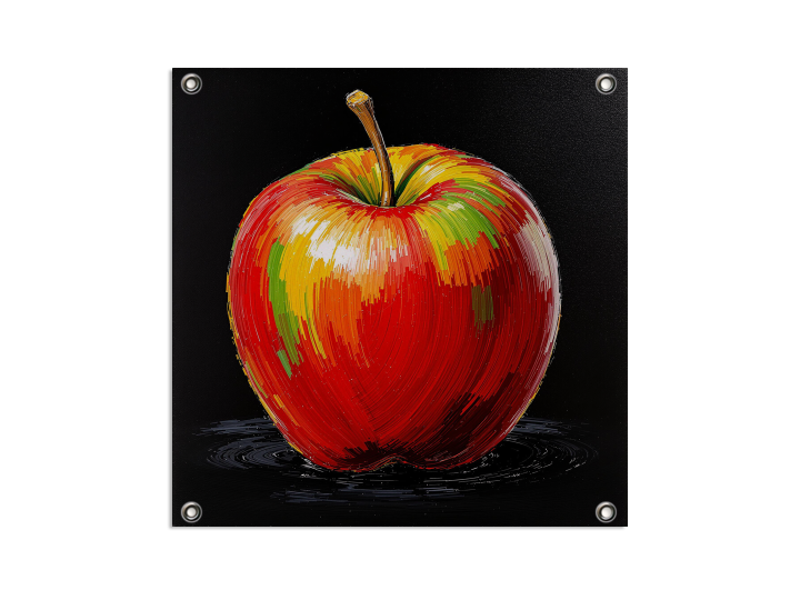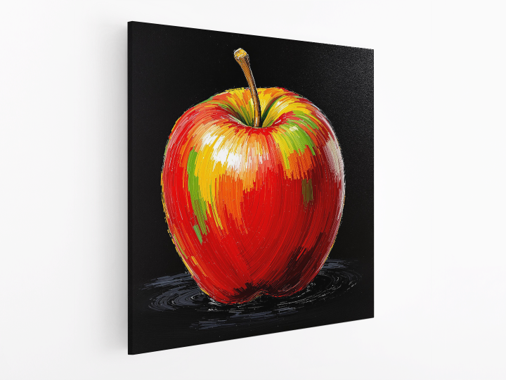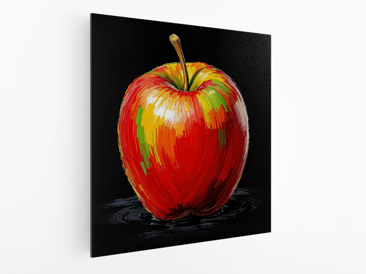 Levendig, expressief en getextureerd schilderachtig beeld van weelderige, sappige appel met gewaagde, vegende penseelstreken van rijk diep rood, geel en groen, levendig, strategisch gemengd om een ​​gevoel van beweging en energie op te roepen, afgezet tegen een dramatische, strakke zwarte achtergrond waardoor de kleuren van de appel kunnen stralen, wat de stijl van postimpressionistische keukenkunst weerspiegelt, met hints van dikke, zware textuur en impasto, alsof de verf met een paletmes is aangebracht, wat de kijker uitnodigt om het glanzende, ronde oppervlak van de vrucht aan te raken.