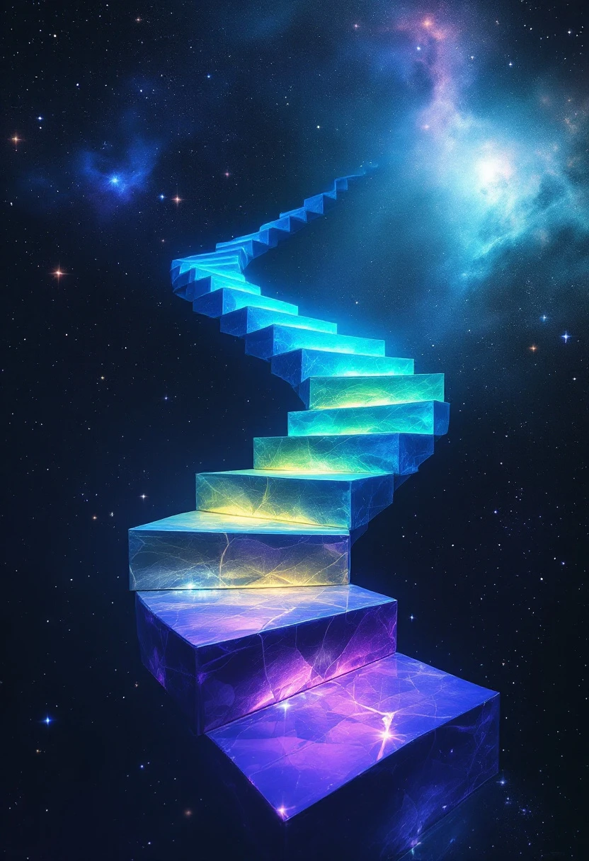 A surrealistic image of a staircase created by beautiful colored stone in the middle of deep space
