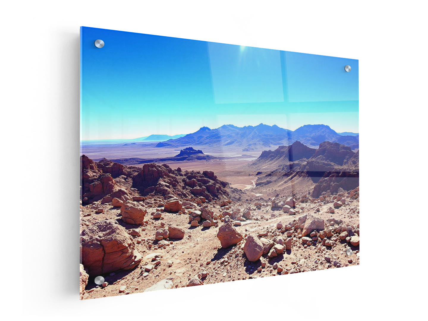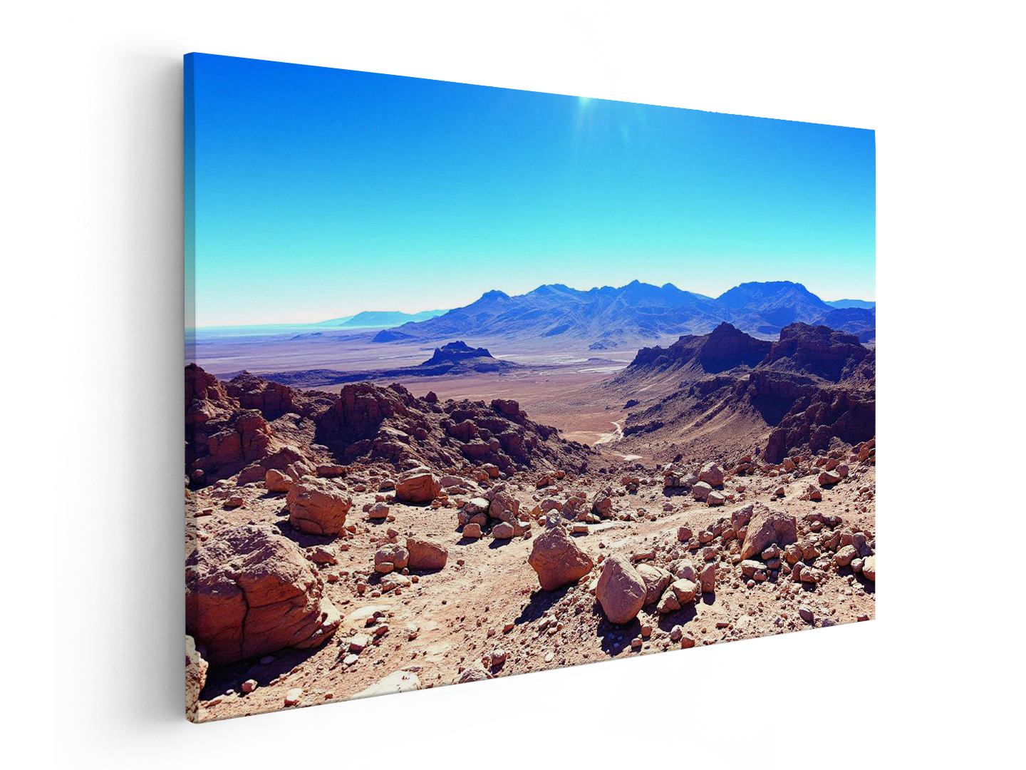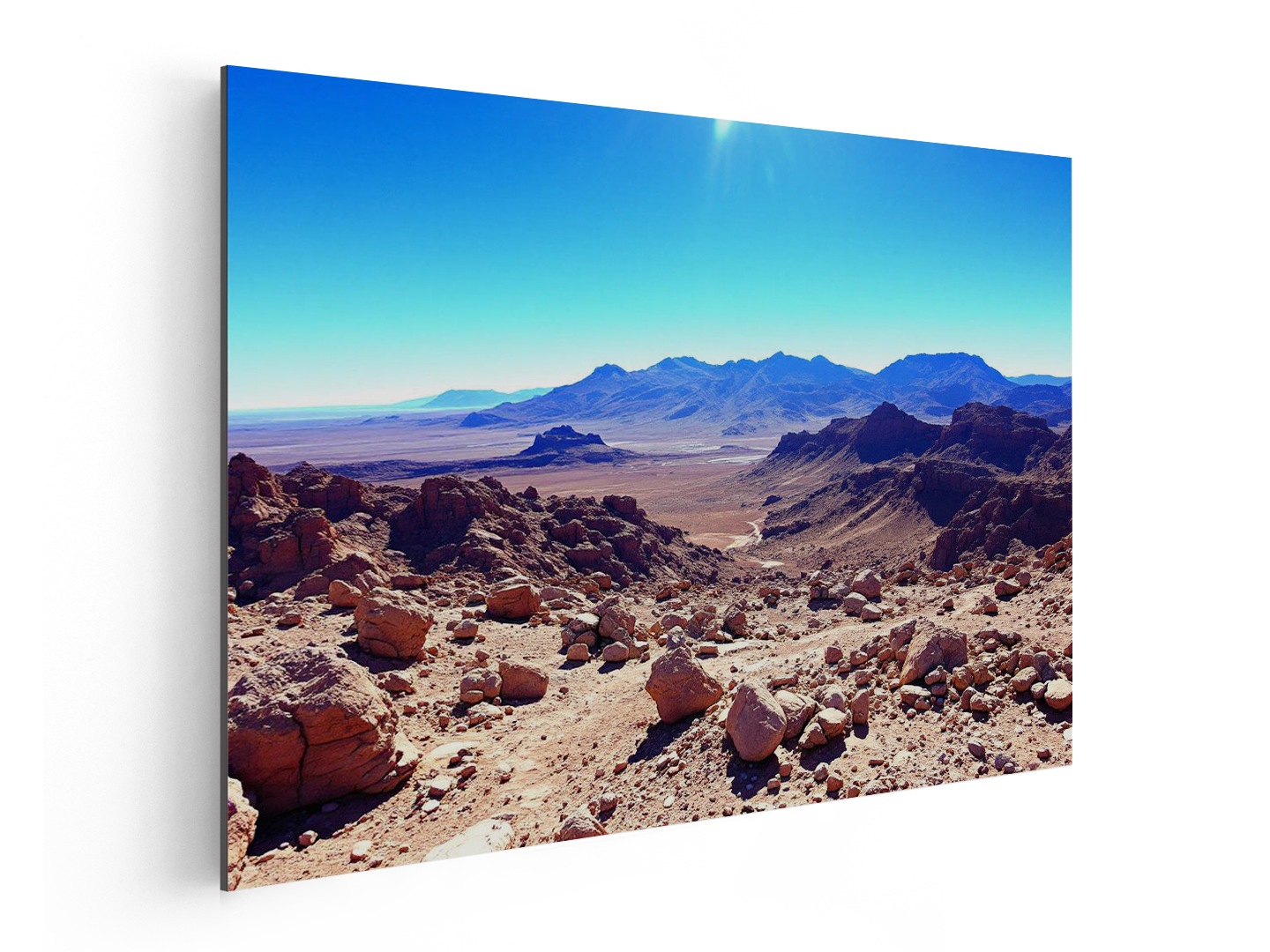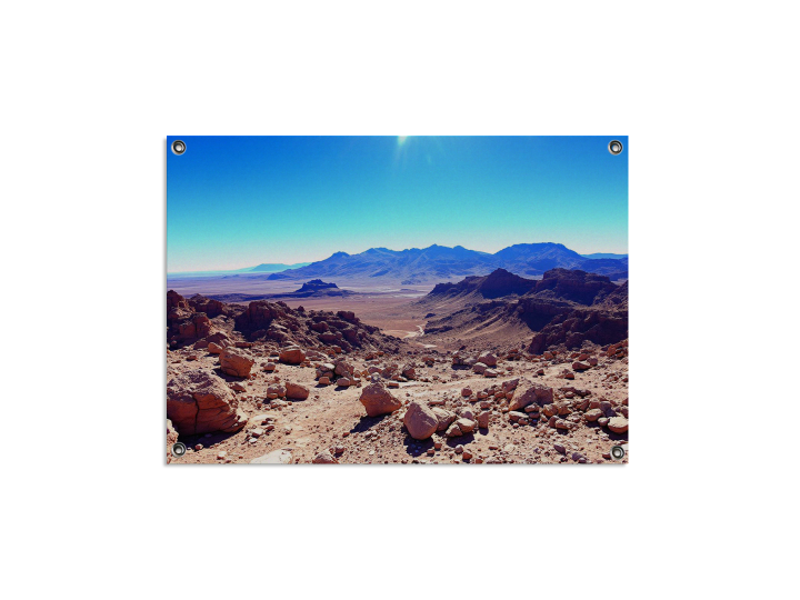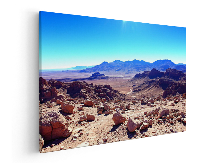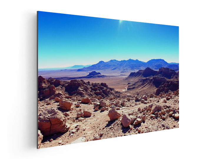 Rotsachtig woestijnlandschap in de Atacama, helderblauwe lucht, extreme helderheid, surrealistische maar realistische uitstraling.