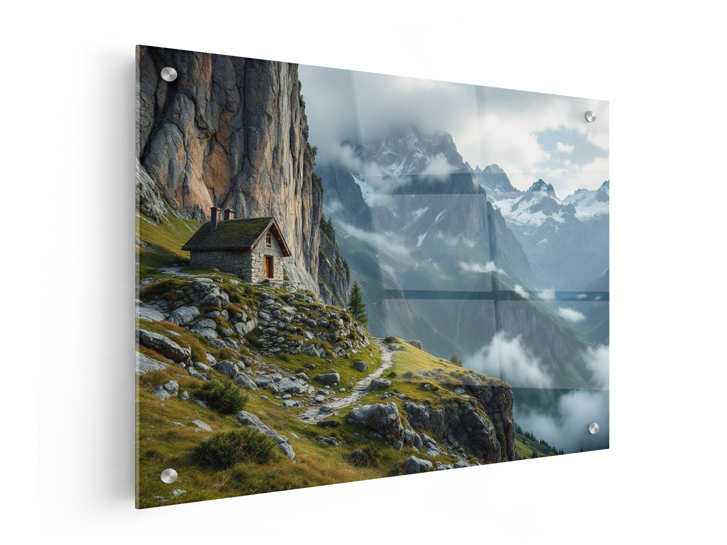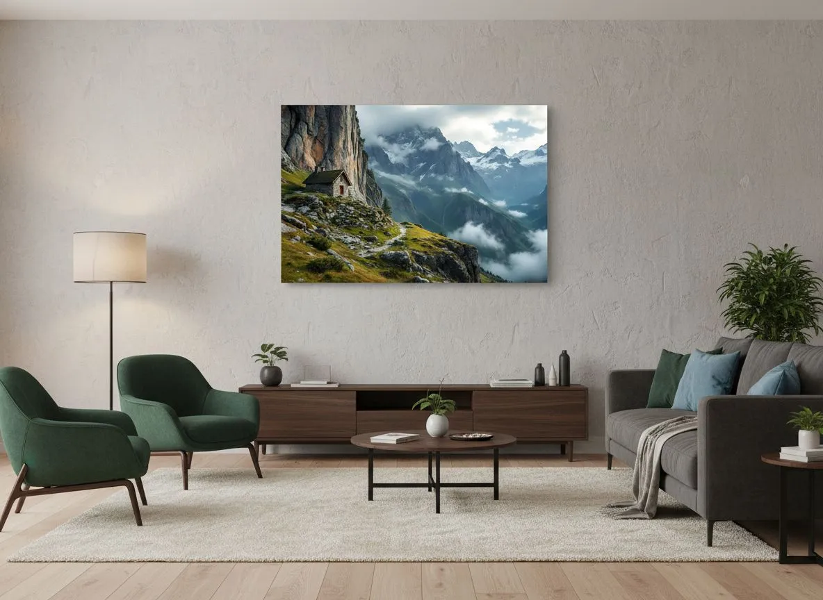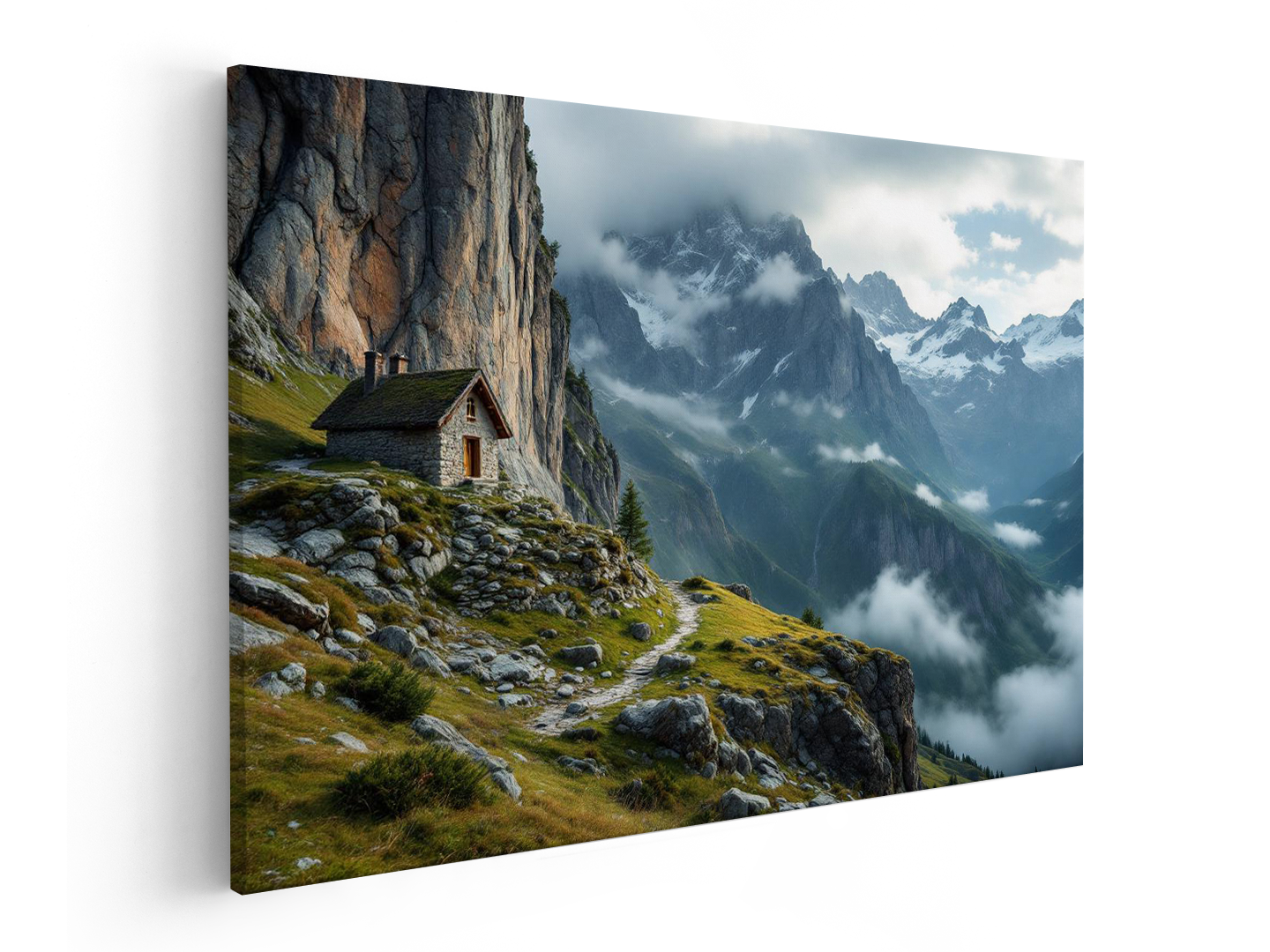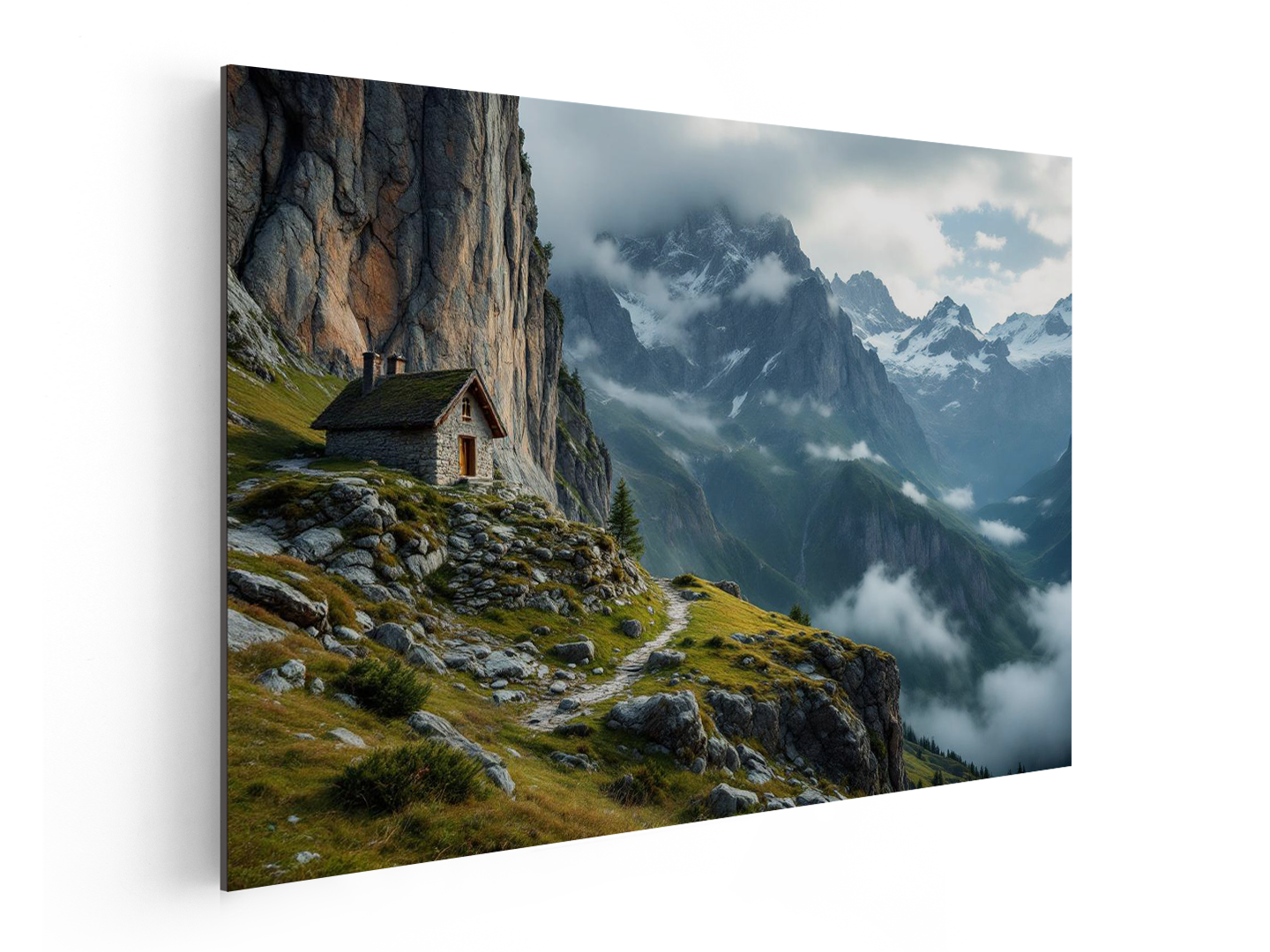 Een ultra-realistische landschapsfoto van een kleine stenen berghut aan de voet van een enorme, steile bergwand, de hut bijna nietig in vergelijking met het landschap, lage bewolking rond de bergtoppen, koel ochtendlicht, dramatische maar rustige sfeer, gefotografeerd met een groothoeklens, hoge resolutie, geschikt voor luxe wanddecoratie.