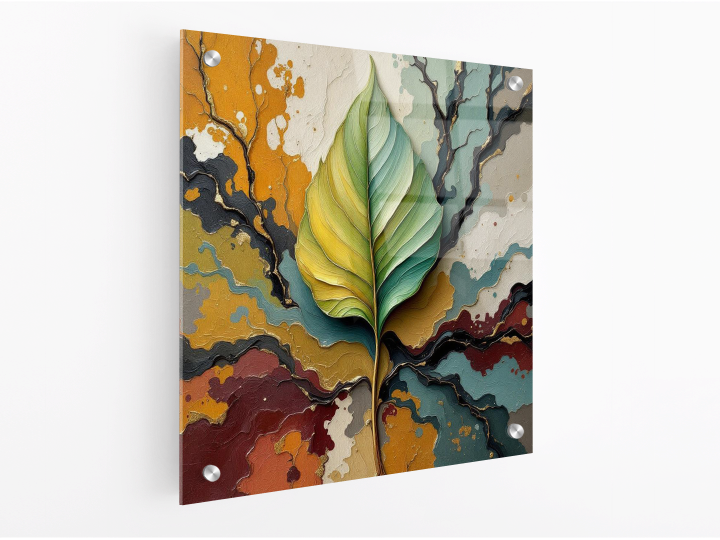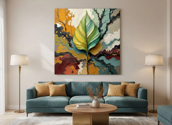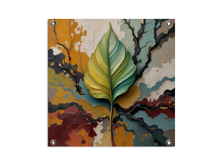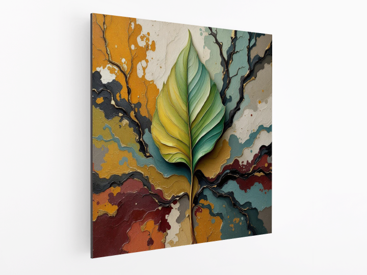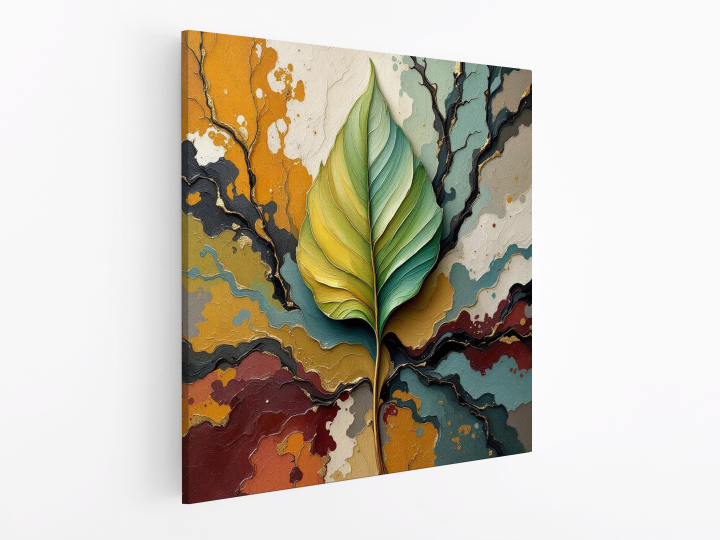 Een abstract schilderij, met een groot blad in het midden, met op de achtergrond verf stroken die takken symboliseren, met prachtige aardse kleuren, en dikke verf texturen.