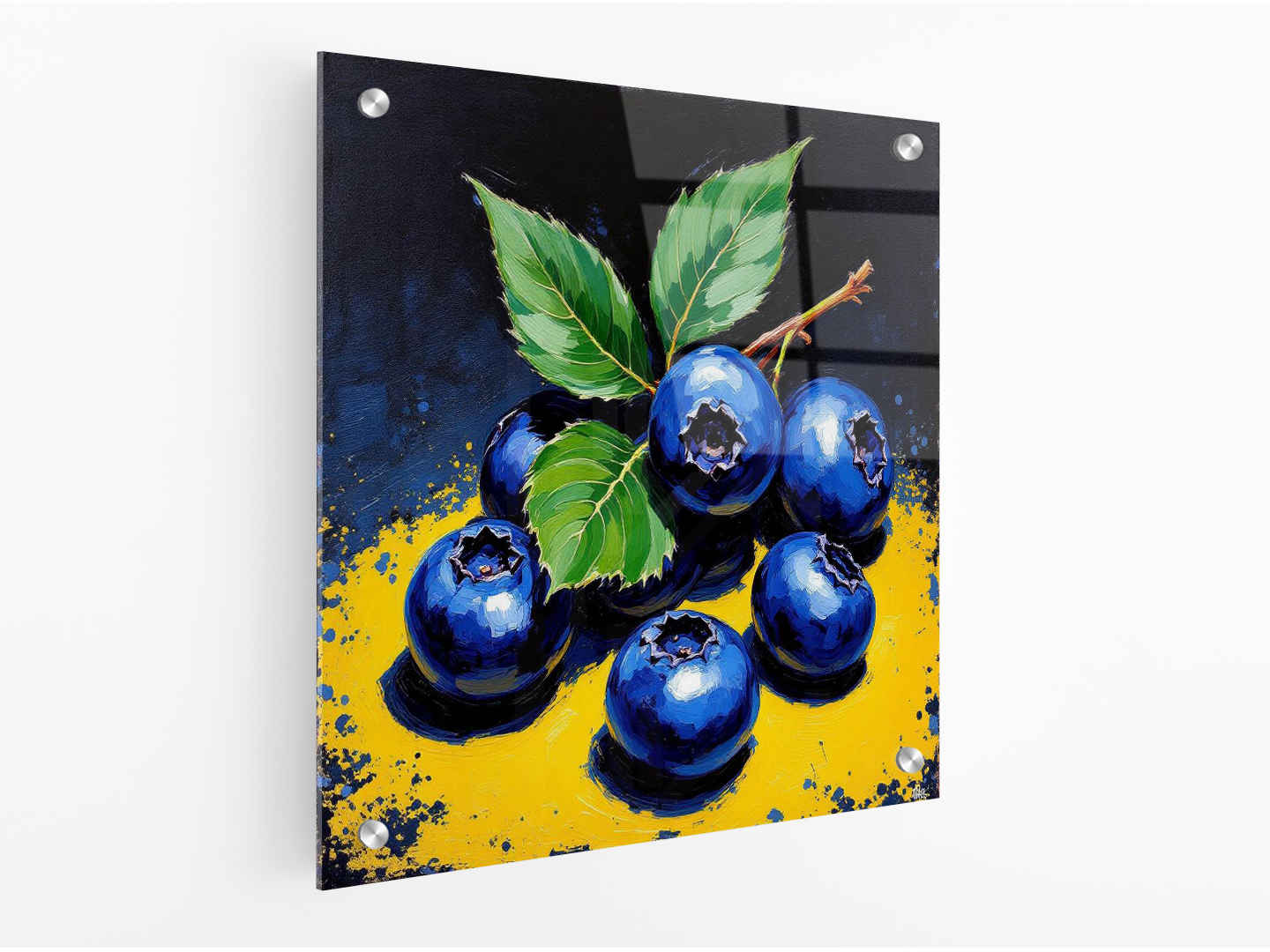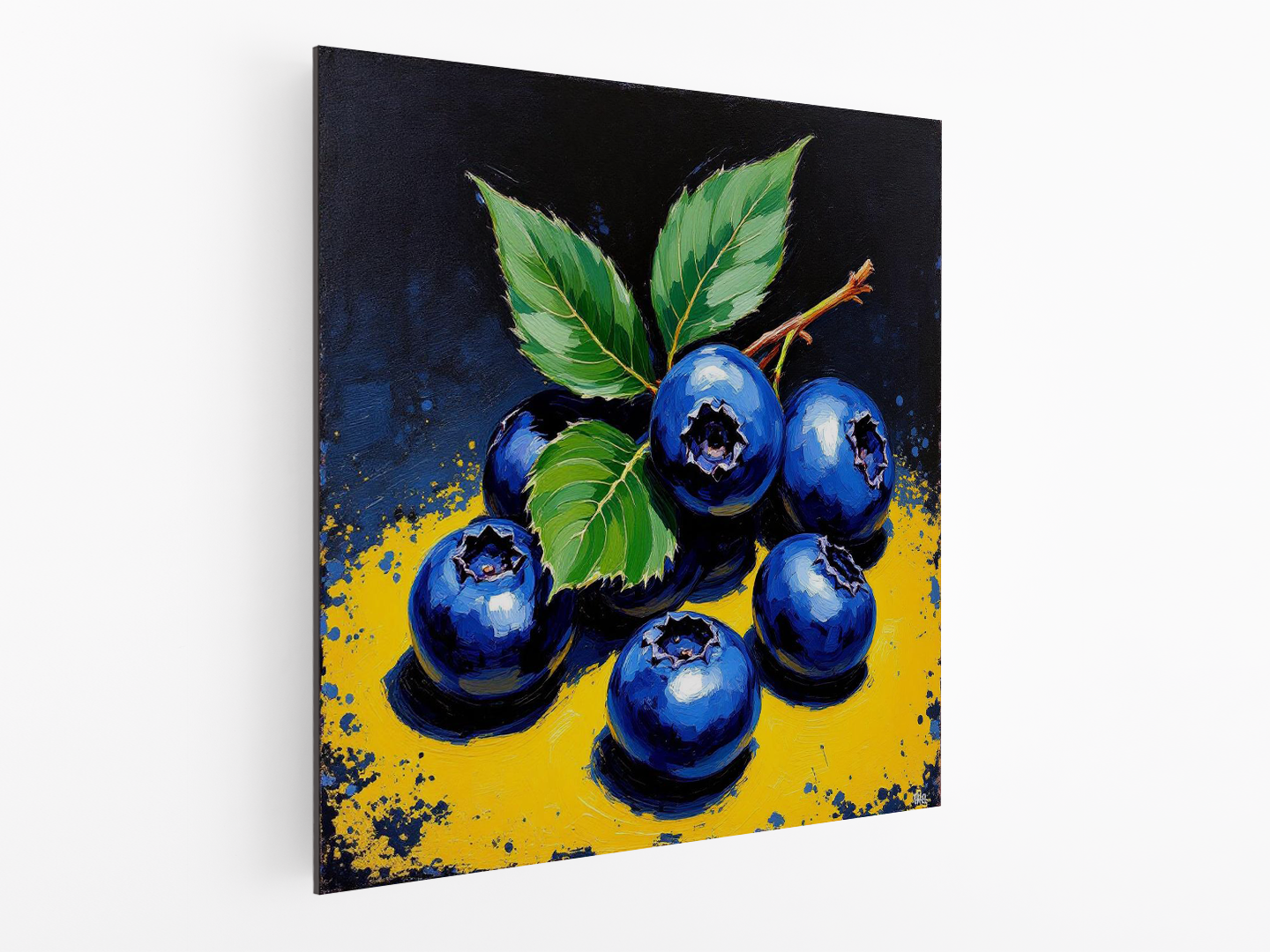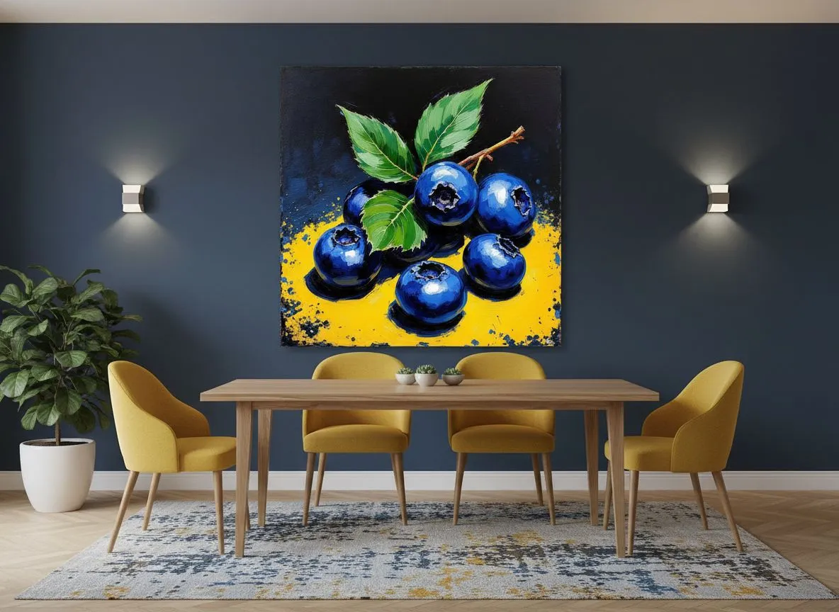 Levendig, expressief en getextureerd schilderachtig beeld van weelderige, sappige blauwe bessen met gewaagde, vegende penseelstreken van rijk diep blauw en paars, levendig, strategisch gemengd om een ​​gevoel van beweging en energie op te roepen, afgezet tegen een dramatische, strakke zwarte en gele achtergrond waardoor de kleuren van de blauwe bessen kunnen stralen, wat de stijl van postimpressionistische keukenkunst weerspiegelt, met hints van dikke, zware textuur en impasto, alsof de verf met een paletmes is aangebracht, wat de kijker uitnodigt om het glanzende, ronde oppervlak van de vrucht aan te raken.