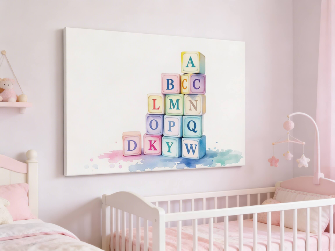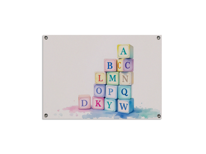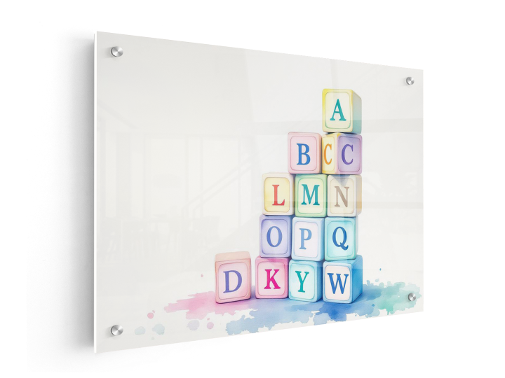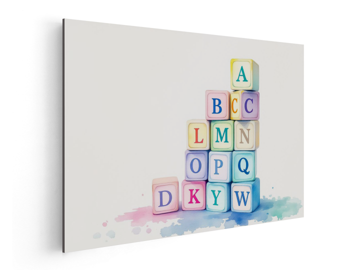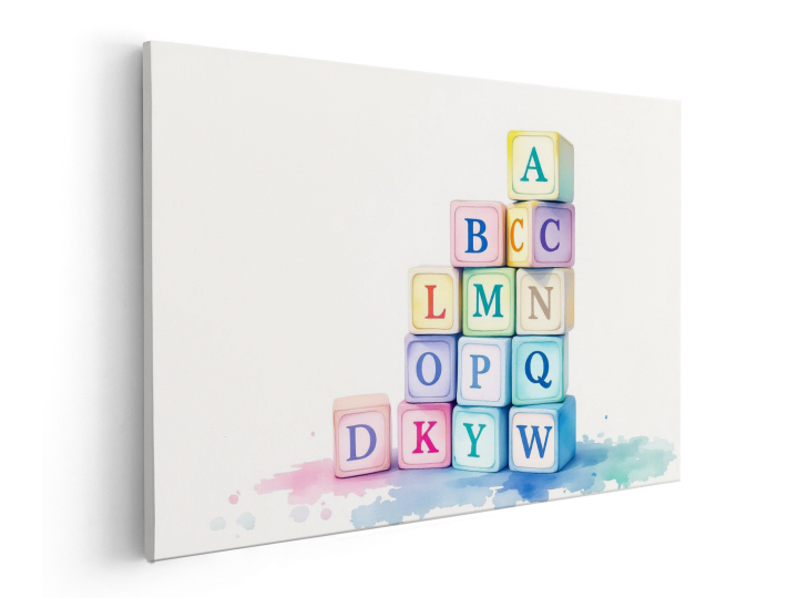 Een abstract aquarel schilderij, met pastelkleurige speelblokken met alfabetische letters, speels opgestapeld, tegen een crèmekleurige achtergrond.