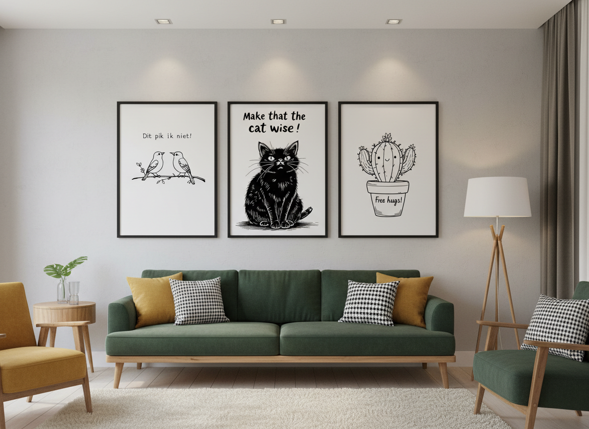 Bij iedere afbeelding benoemen wij de prompt waarmee wij dit design hebben gegenereerd. Zo kun je eenvoudig aanpassingen maken die jouw visie uniek maken en op de pagina 'Maak jouw wanddecoratie' zelf een design creeren dat niemand anders heeft!