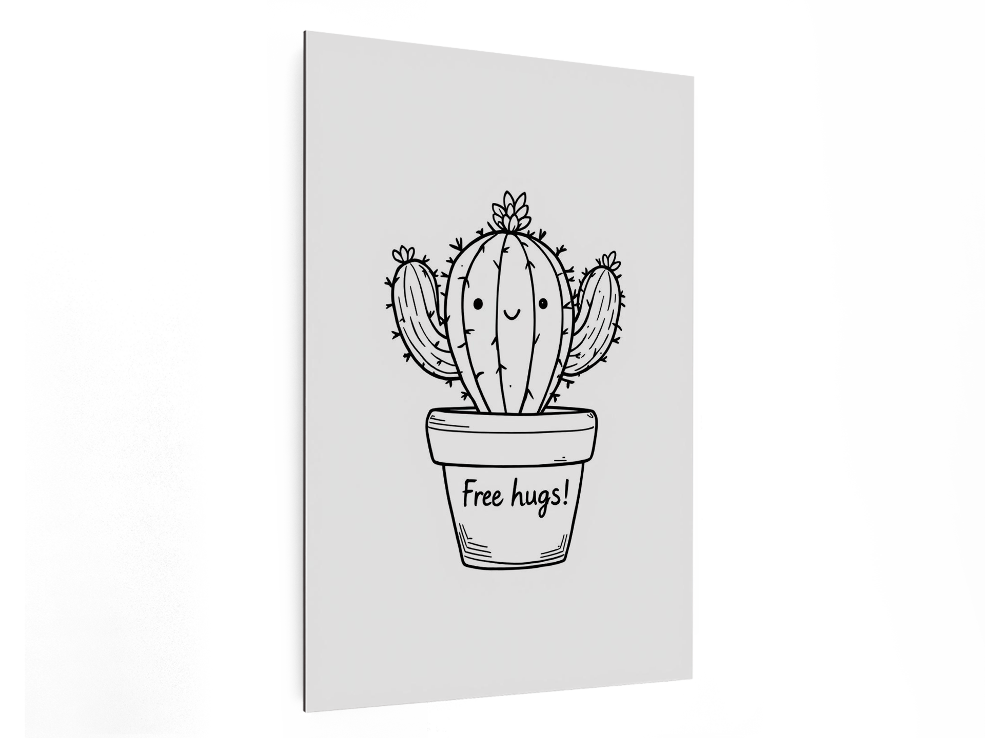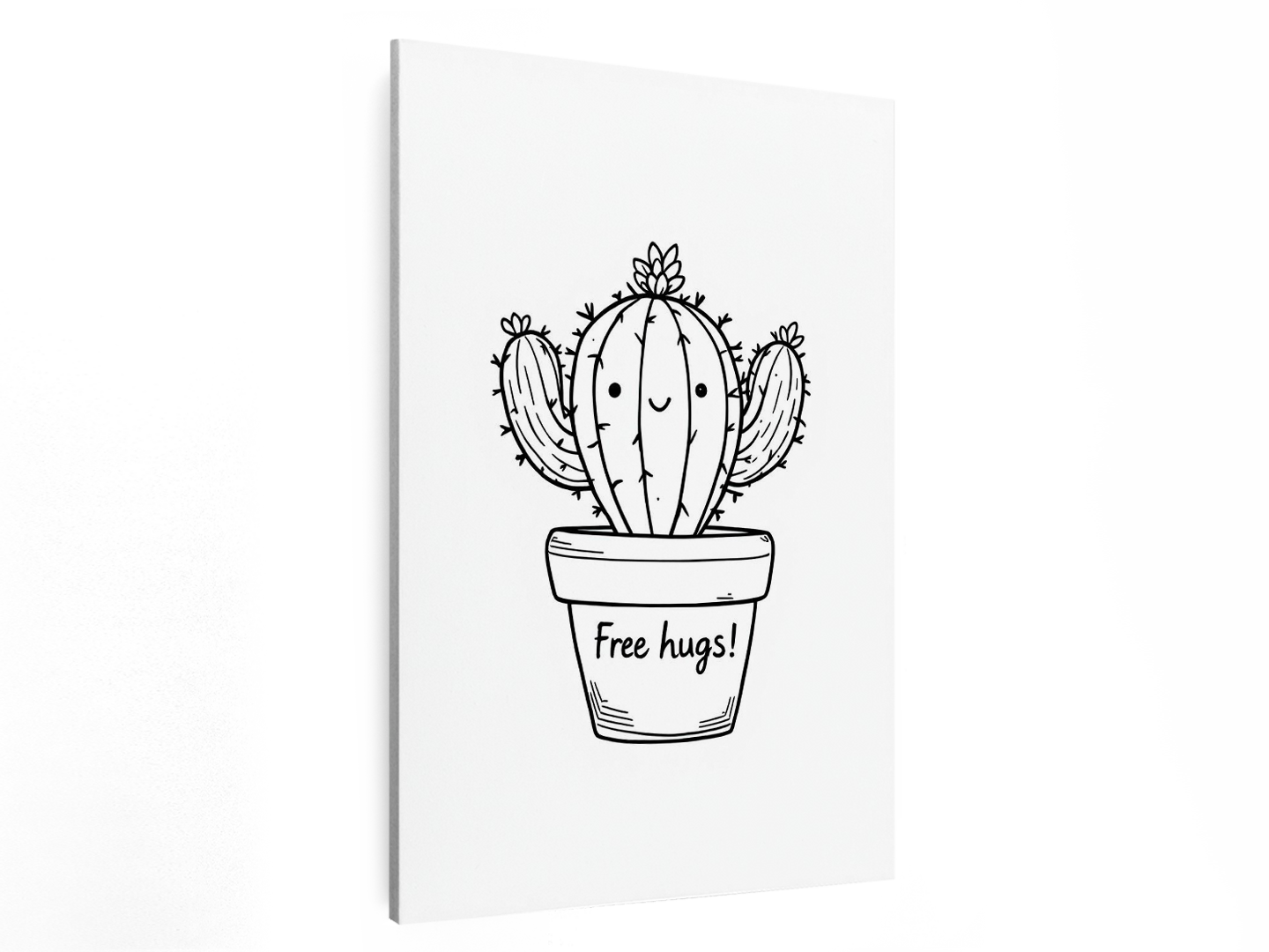 Een modern minimalistisch zwart en wit line art design, van een schattige cactus met een gezichtje, die in een potje staat met de tekst: ´Free hugs!´.