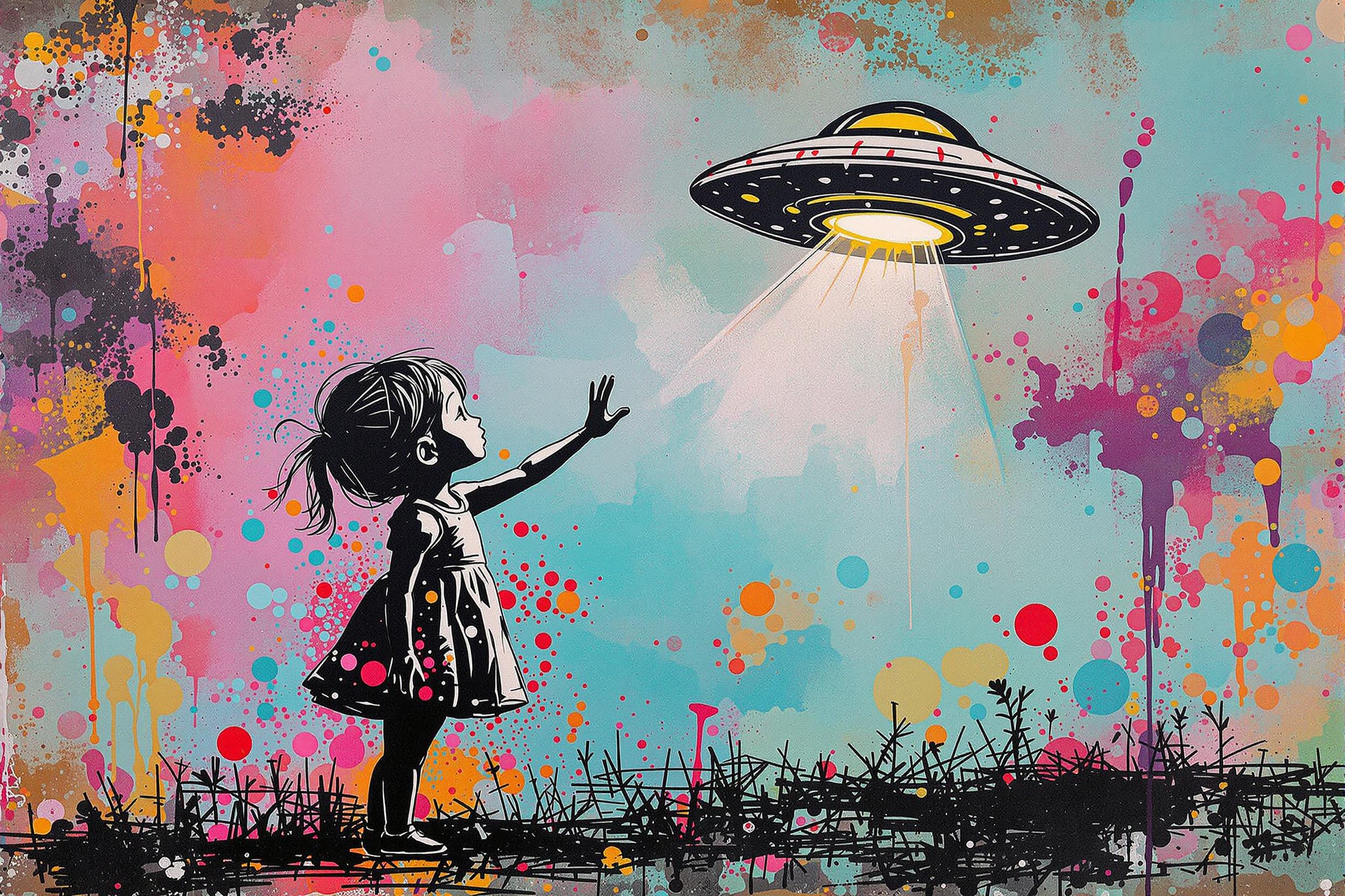 Een graffiti kunstwerk van een klein meisje dat gedag zwaait naar een UFO, in de kunst stijl van Banksy