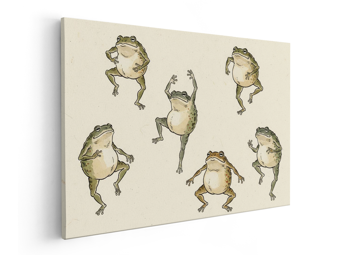De lijnen voelen spontaan, schetsmatig en imperfect aan. De kleur is spaarzaam aangebracht met handgeschilderde aquarelverf: gedempt mosgroen, olijfgroen, warm grijs, licht oker, kleine accenten van vermiljoen. Geen felle pastelkleuren, geen vloeiende kleurovergangen. De kikkers lijken deel uit te maken van een humoristische observatiestudie van beweging en gebaren, vergelijkbaar met schetsen van natuurhistorische onderwerpen of speelse inkttekeningen, en zijn geen gestileerde personages of mascottes. De achtergrond is warm gebroken wit washi-papier met een subtiele vezelstructuur. Luchtige compositie met kikkers verspreid in verschillende houdingen, zonder symmetrie of herhaling. Afbeelding in hoge resolutie, plat, printklaar, tijdloos en met een ambachtelijke uitstraling. Zonder handtekeningen of kanji.
