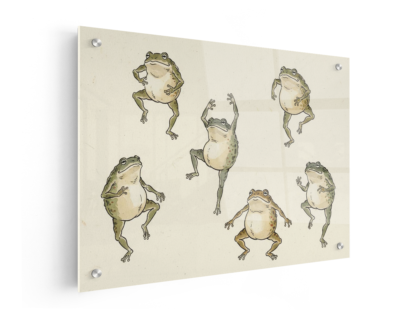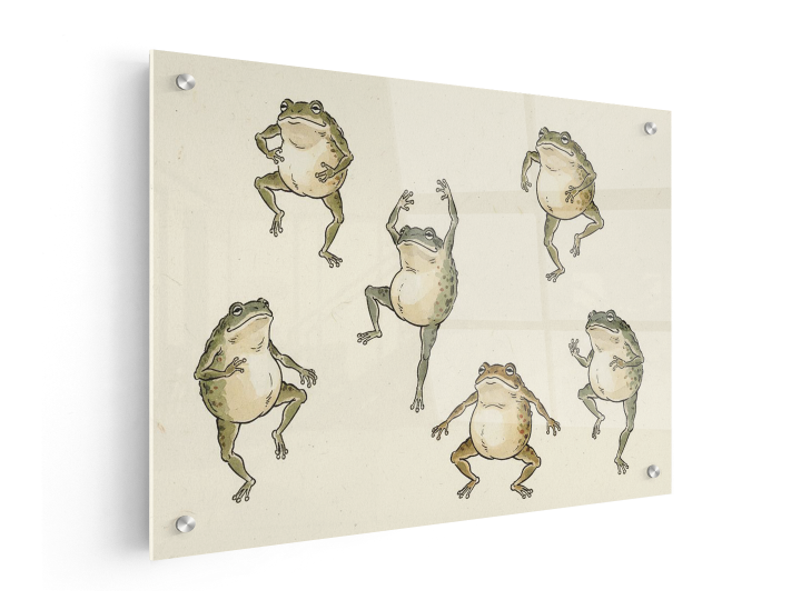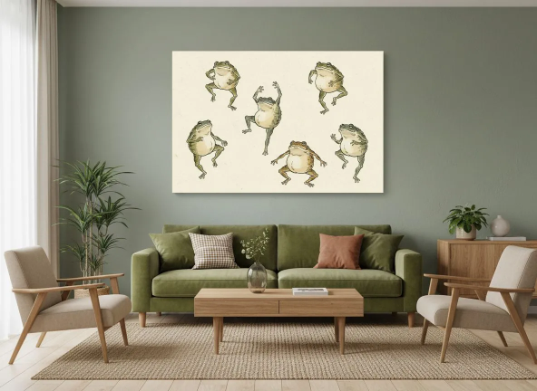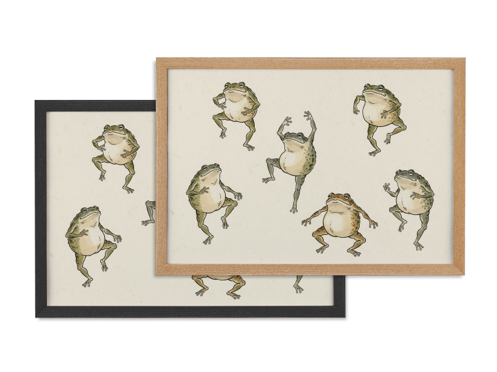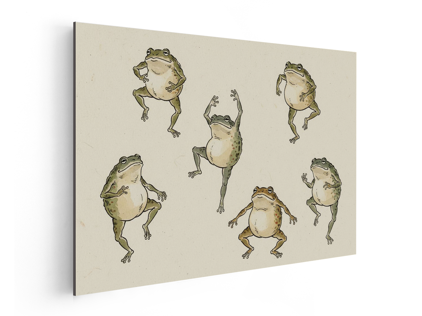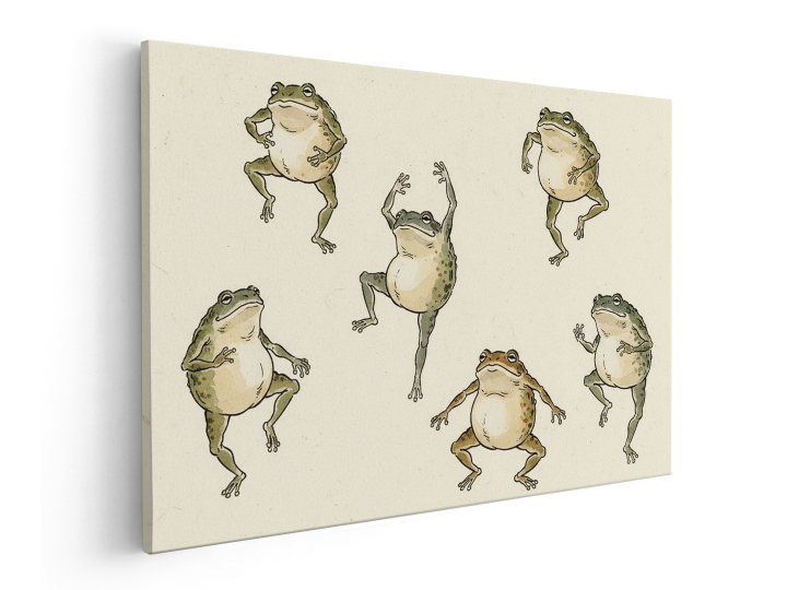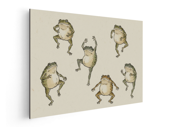 Een decoratieve illustratie van expressieve, mensachtige kikkers, getekend in een traditionele inkt- en aquarel techniek. De kikkers zijn ietwat onhandig, zwaarlijvig en aards in plaats van schattig: ronde buiken, lange, ongelijke ledematen, benige ellebogen, zichtbare gewrichten en asymmetrische houdingen. Terwijl ze dansen en drinken in een moerasgebied, zijn hun gezichten expressief maar ingetogen, met open monden, alerte ogen en een licht komische ernst. Getekend met energieke sumi-inkt penseel lijnen: ongelijkmatige dikte, droge penseel textuur, zichtbare begin- en eindpunten van de penseelstreek. De lijnen voelen spontaan, schetsmatig en imperfect aan. De kleur is spaarzaam aangebracht met handgeschilderde aquarelverf: gedempt mosgroen, olijfgroen, warm grijs, licht oker, kleine accenten van vermiljoen. Geen felle pastelkleuren, geen vloeiende kleurovergangen. De kikkers lijken deel uit te maken van een humoristische observatiestudie van beweging en gebaren, vergelijkbaar met schetsen van natuurhistorische onderwerpen of speelse inkttekeningen, en zijn geen gestileerde personages of mascottes. De achtergrond is warm gebroken wit washi-papier met een subtiele vezelstructuur. Luchtige compositie met kikkers verspreid in verschillende houdingen, zonder symmetrie of herhaling. Afbeelding in hoge resolutie, plat, printklaar, tijdloos en met een ambachtelijke uitstraling. Zonder handtekeningen of kanji.