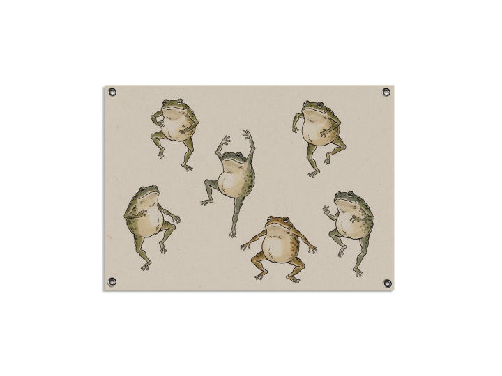 Een decoratieve illustratie van expressieve, mensachtige kikkers, getekend in een traditionele inkt- en aquarel techniek. De kikkers zijn ietwat onhandig, zwaarlijvig en aards in plaats van schattig: