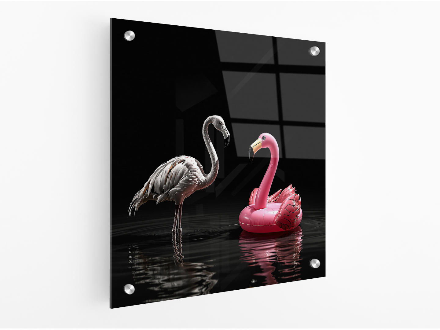 Een episch zwart en wit foto realistisch plaatje, van een flamingo die in ondiep water staat, en kijkt naar een roze opblaas flamingo die op het water drijft.