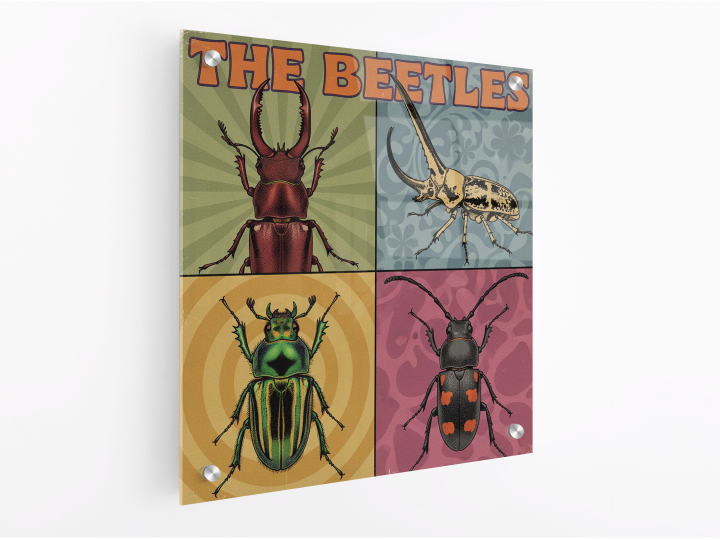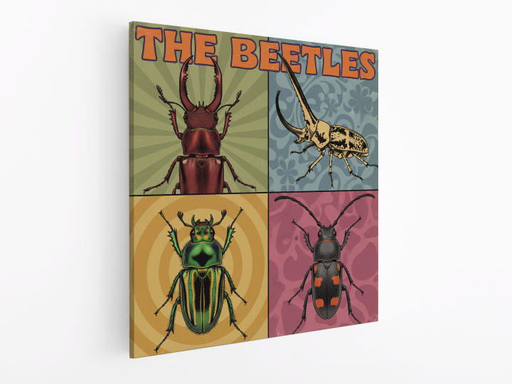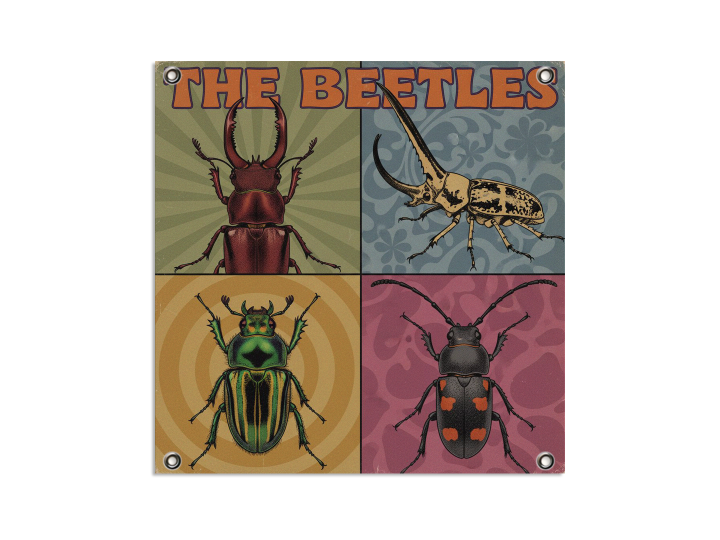 Een vintage pop-art albumhoes ontwerp uit de jaren 60, verdeeld in vier gelijke vierkante panelen (raster van 2×2).Elk paneel toont een zeer gedetailleerd portret van een andere kever, ingelijst als een klassiek studioportret. De kevers zijn: