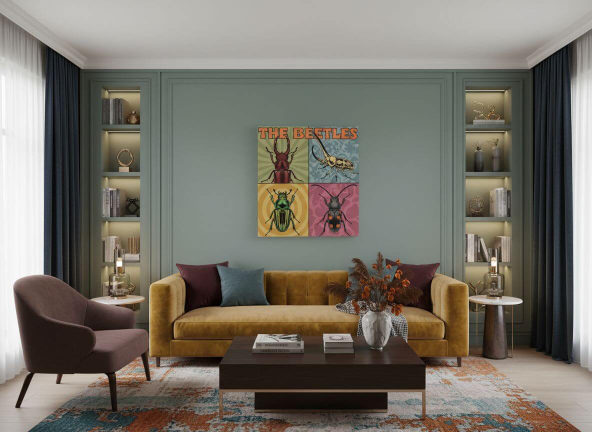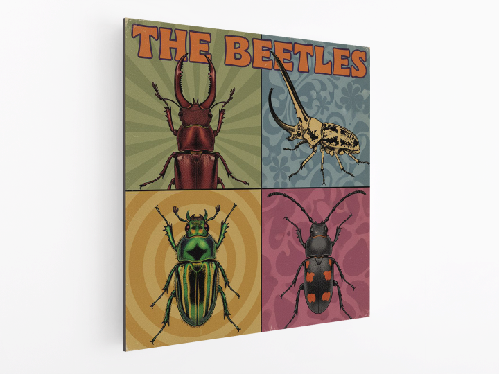 Een vintage pop-art albumhoes ontwerp uit de jaren 60, verdeeld in vier gelijke vierkante panelen (raster van 2x2).Elk paneel toont een zeer gedetailleerd portret van een andere kever, ingelijst als een klassiek studioportret. De kevers zijn: - Lucanus cervus, - Dynastes hercules, - Chrysina gloriosa, - Batocera rufomaculata, Alle kevers zijn realistische insecten (Coleoptera), met een accurate anatomie, zes poten, een exoskelet en macro details, geen zoogdieren, geen hoorns van dieren, geen vacht. Zachte studioverlichting, gedempte achtergrondkleuren, esthetiek van album fotografie uit de jaren 60, met de tekst "The Beetles".