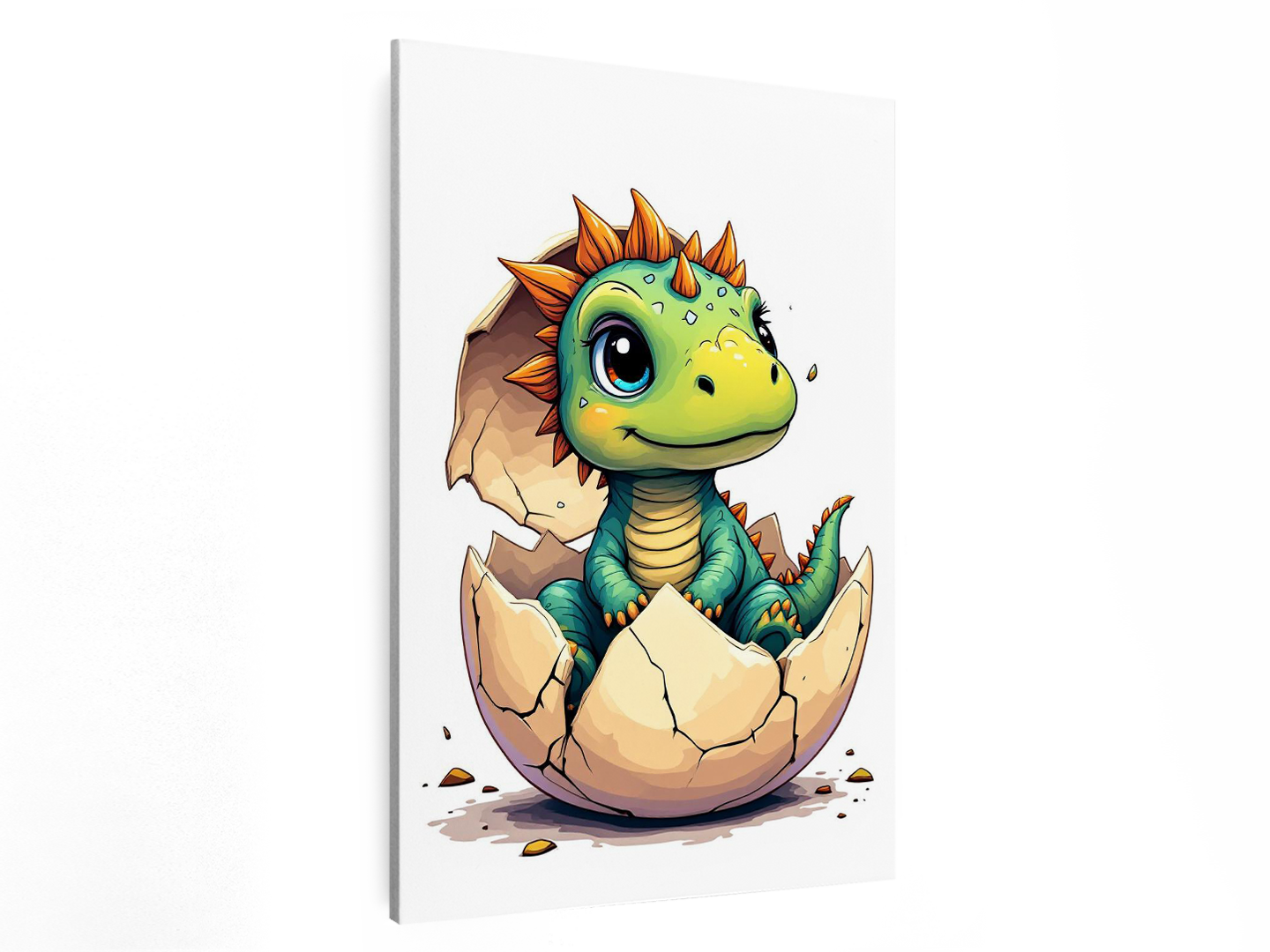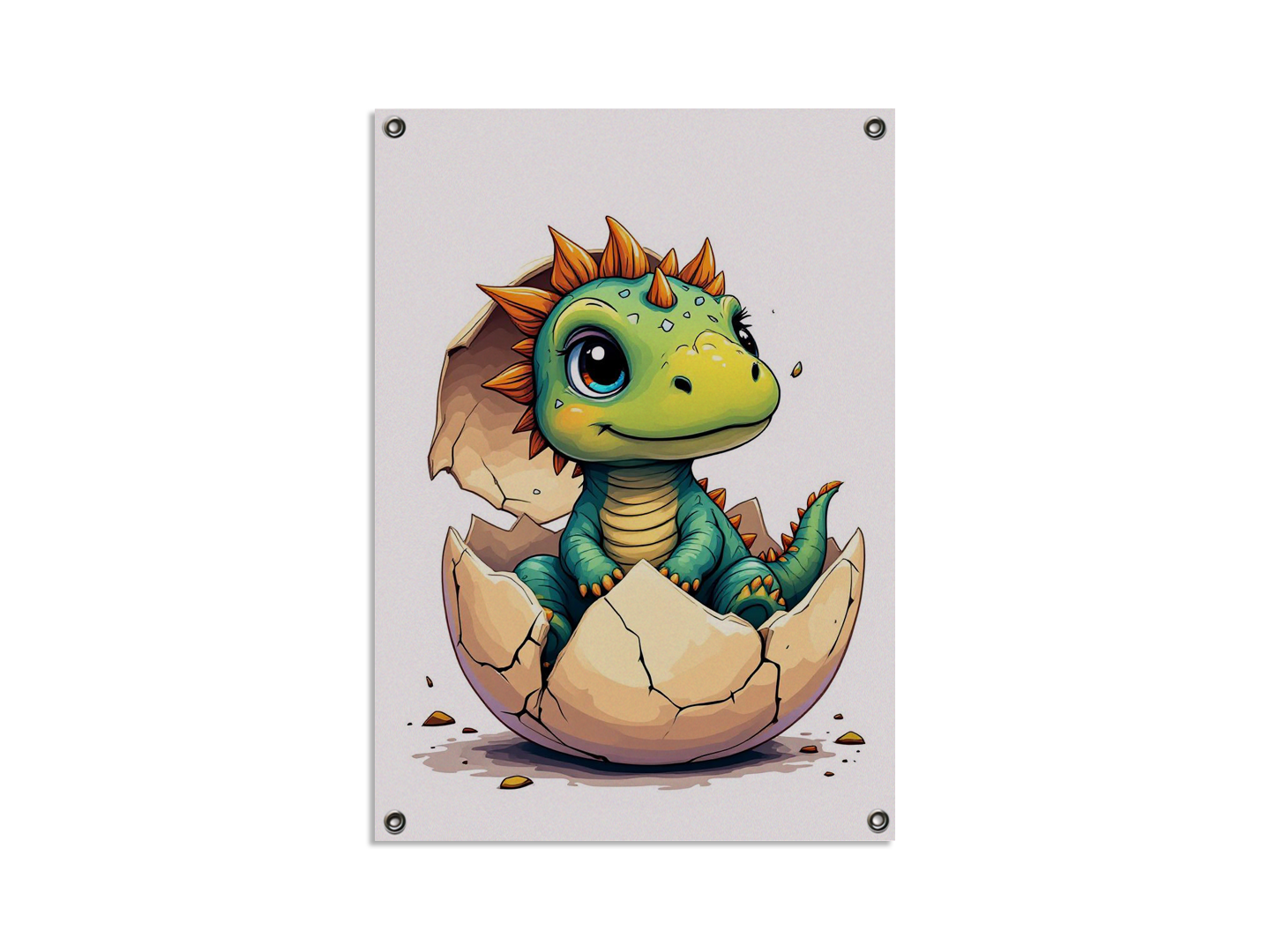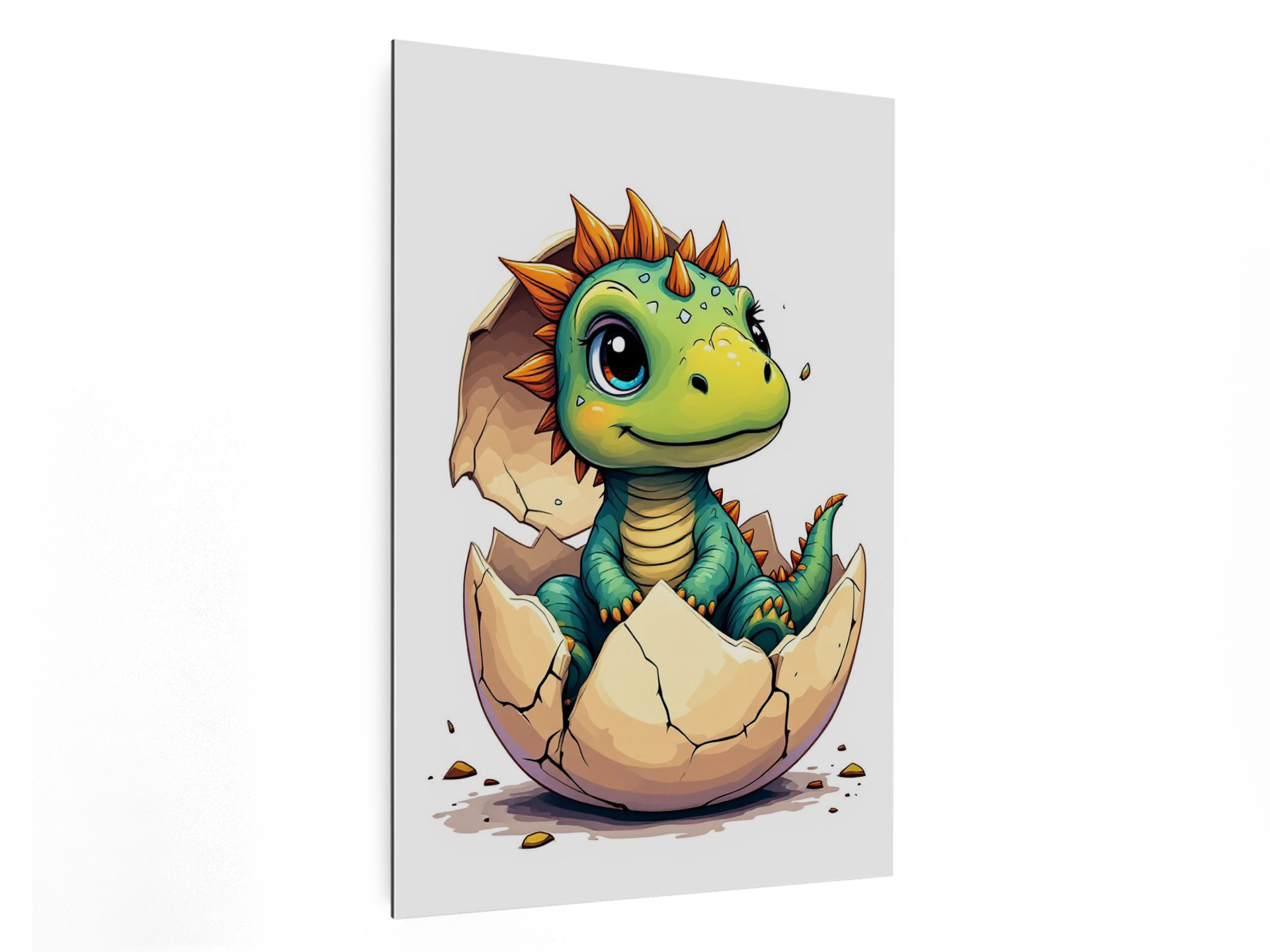 Een epische en grafische illustratie in New School-stijl van een net uitgekomen dino-ei, met een schattige baby stegosaurus die in het opengebarsten ei zit, met een stukje eierschaal nog op zijn hoofd. Een schattige kinder cartoon, met een minimalistische witte achtergrond.