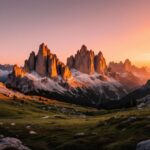 De Dolomieten tijdens golden hour, ruige kalkstenen pieken, warme zonsondergang, diepe schaduwen, kristalheldere lucht, professionele landschapsfotografie, panoramische compositie.