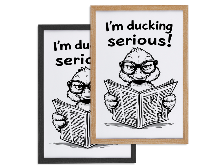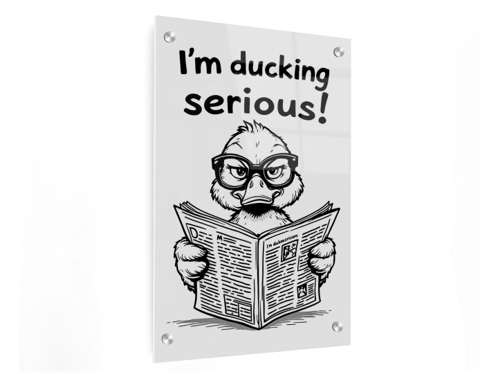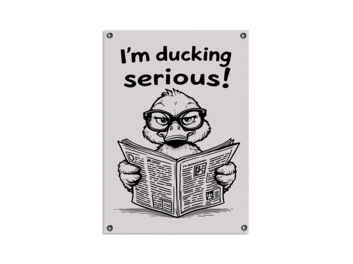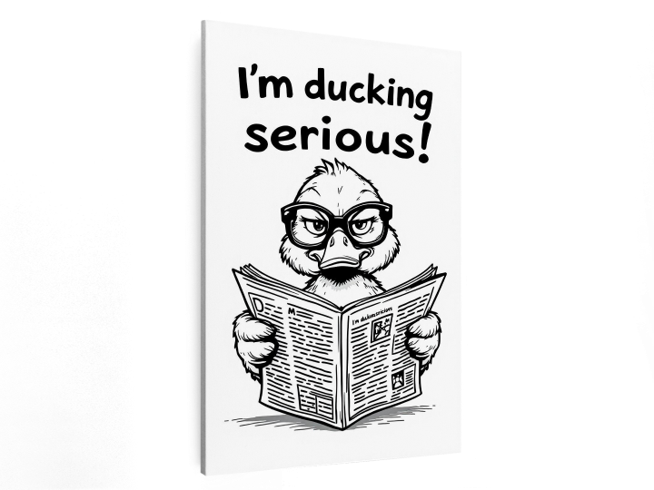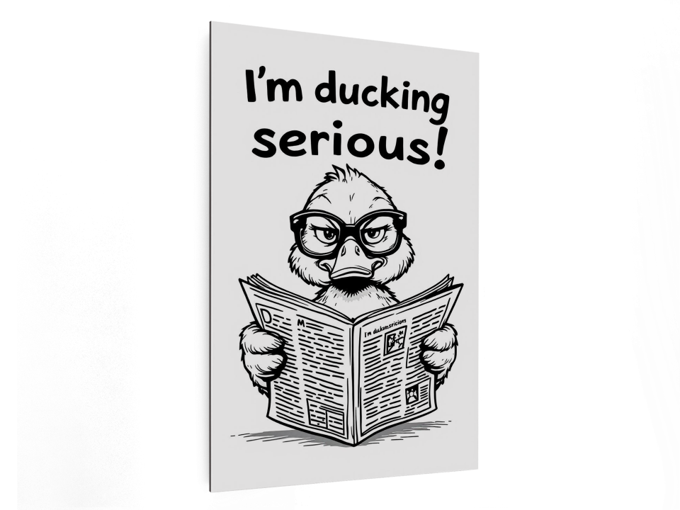Een modern, minimalistisch, line art design, van een eend met een bril op, die serieus en komisch over een opengevouwen krant kijkt, met de tekst: ´I´m ducking serious!´ er boven, zwart en wit design met veel leegte, met een witte achtergrond.