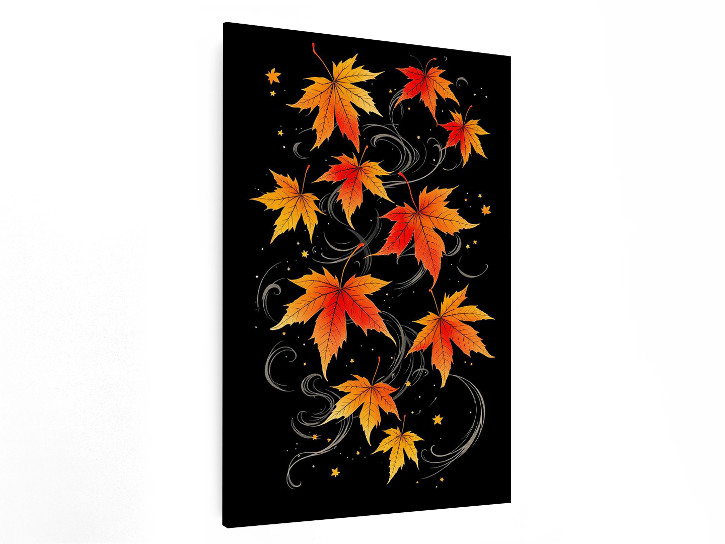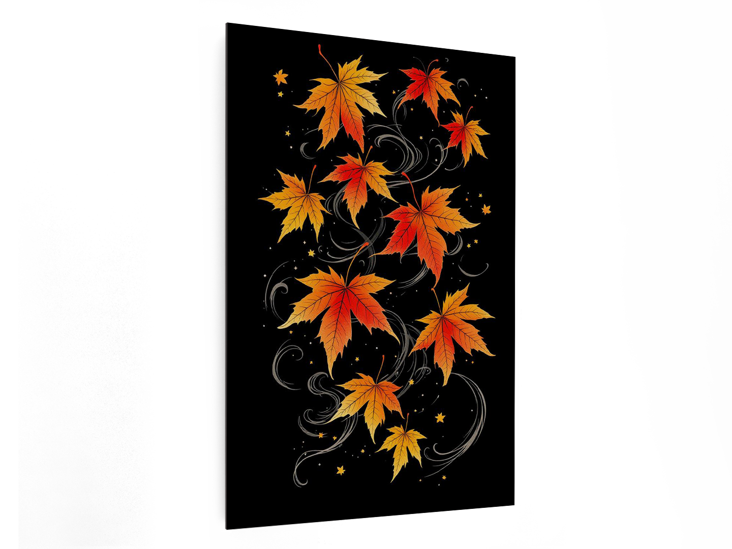 Een tattoo design, in een Japanse stijl, irezumi, van esdoorn bladeren met prachtige herfst kleuren, met een donkere achtergrond en wind vlagen.