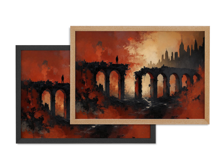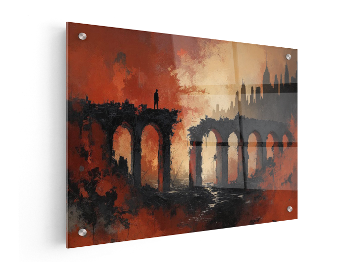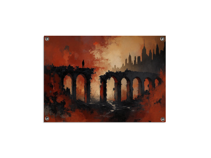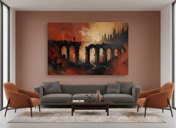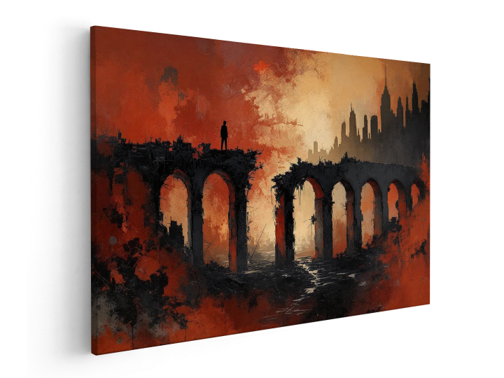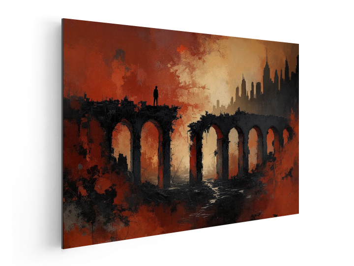 Een abstract schilderij met dramatisch contrast, aardse kleuren, rood en zwart, met dikke verf texturen en zware, chaotische penseelstreken, dat een vage en minimalistische indruk geeft van een verlaten en vervallen betonnen brug in een woestenij met een skyline op de achtergrond.