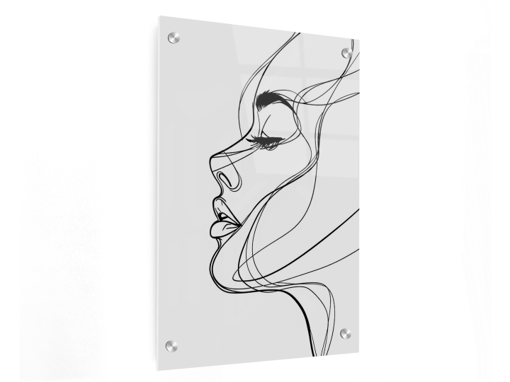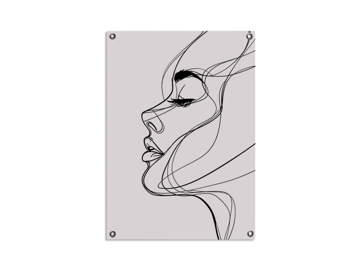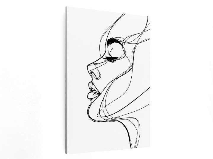 Minimalistische doorlopende lijntekening van een vrouwelijk gezicht in profiel, enkele zwarte lijn, witte achtergrond, moderne wanddecoratie, elegant en rustig, hoog contrast, geen schaduwen.