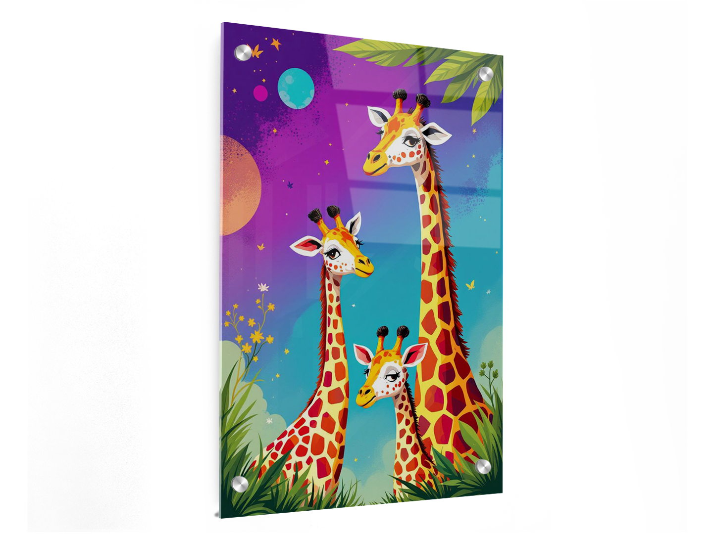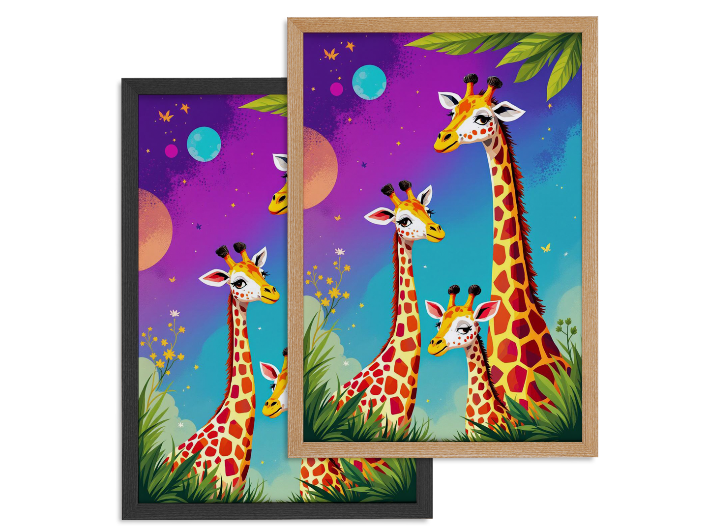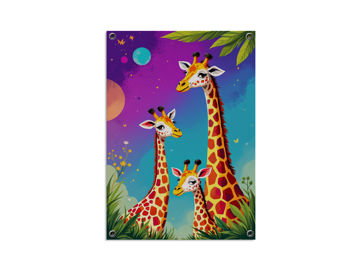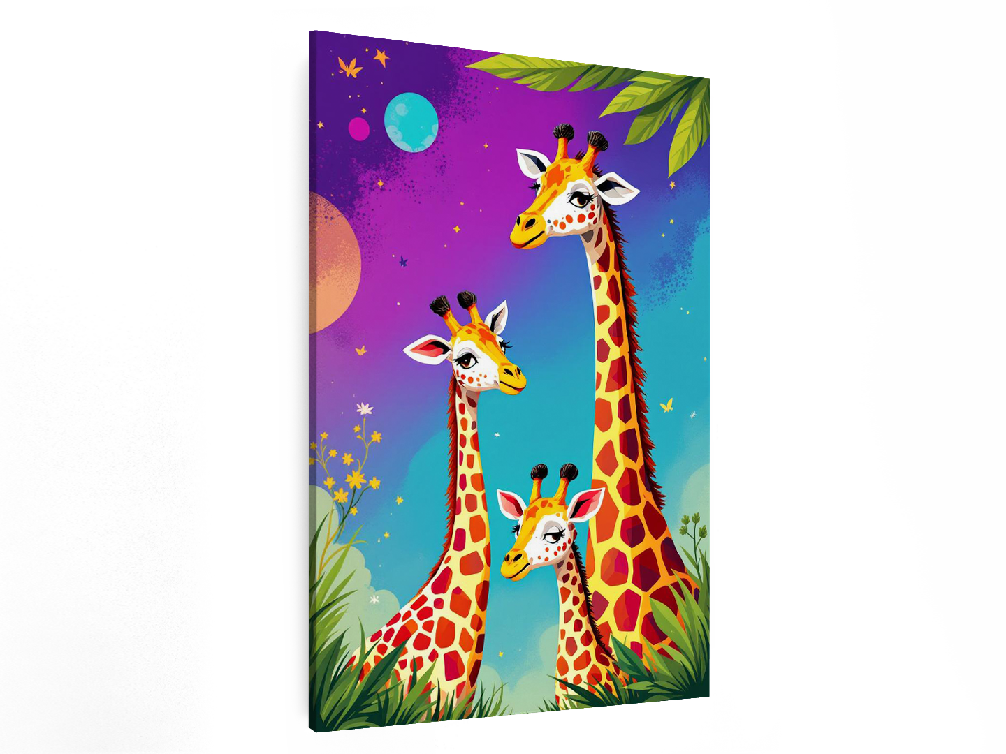 Een kleurrijk pop art portret van een giraffen gezin, papa, mama en een baby giraf, schattige kinderlijke illustratie stijl.