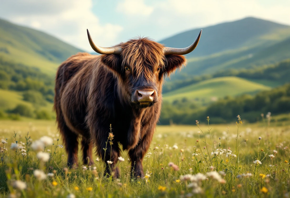 Een fotorealistische afbeelding van een hooglander die op een veld graast