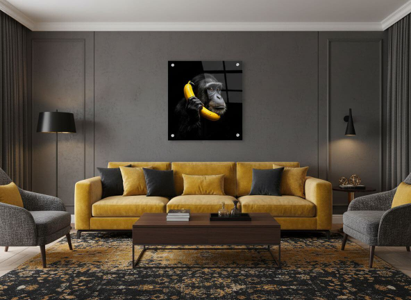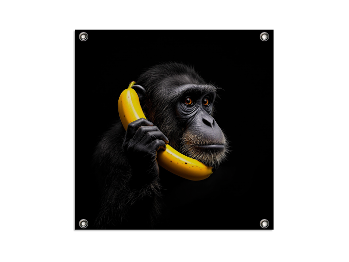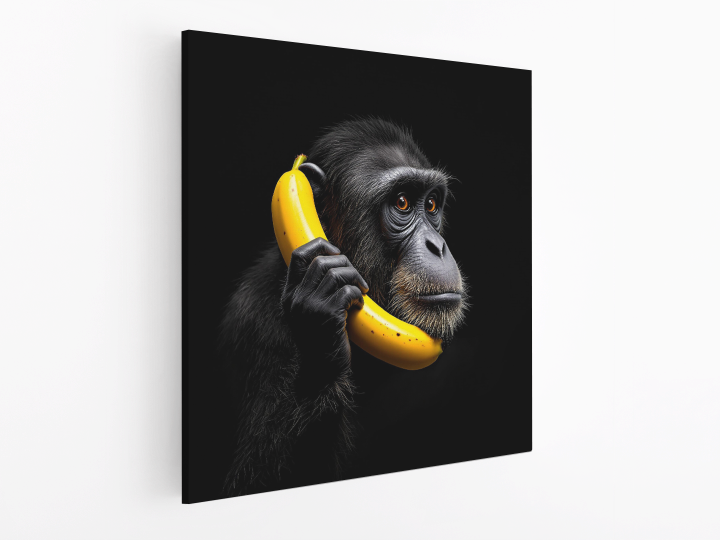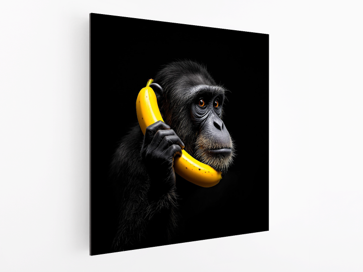 Een epische zwart-wit foto realistische close-up van een aap die een gele banaan tegen zijn oor houdt en doet alsof het een telefoon is, met een donkere achtergrond, alleen de banaan heeft kleur.