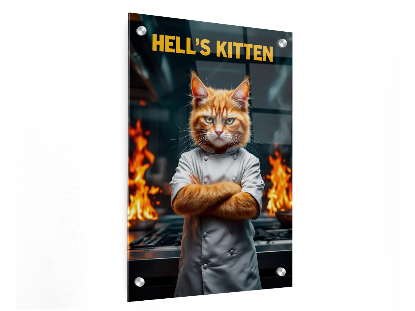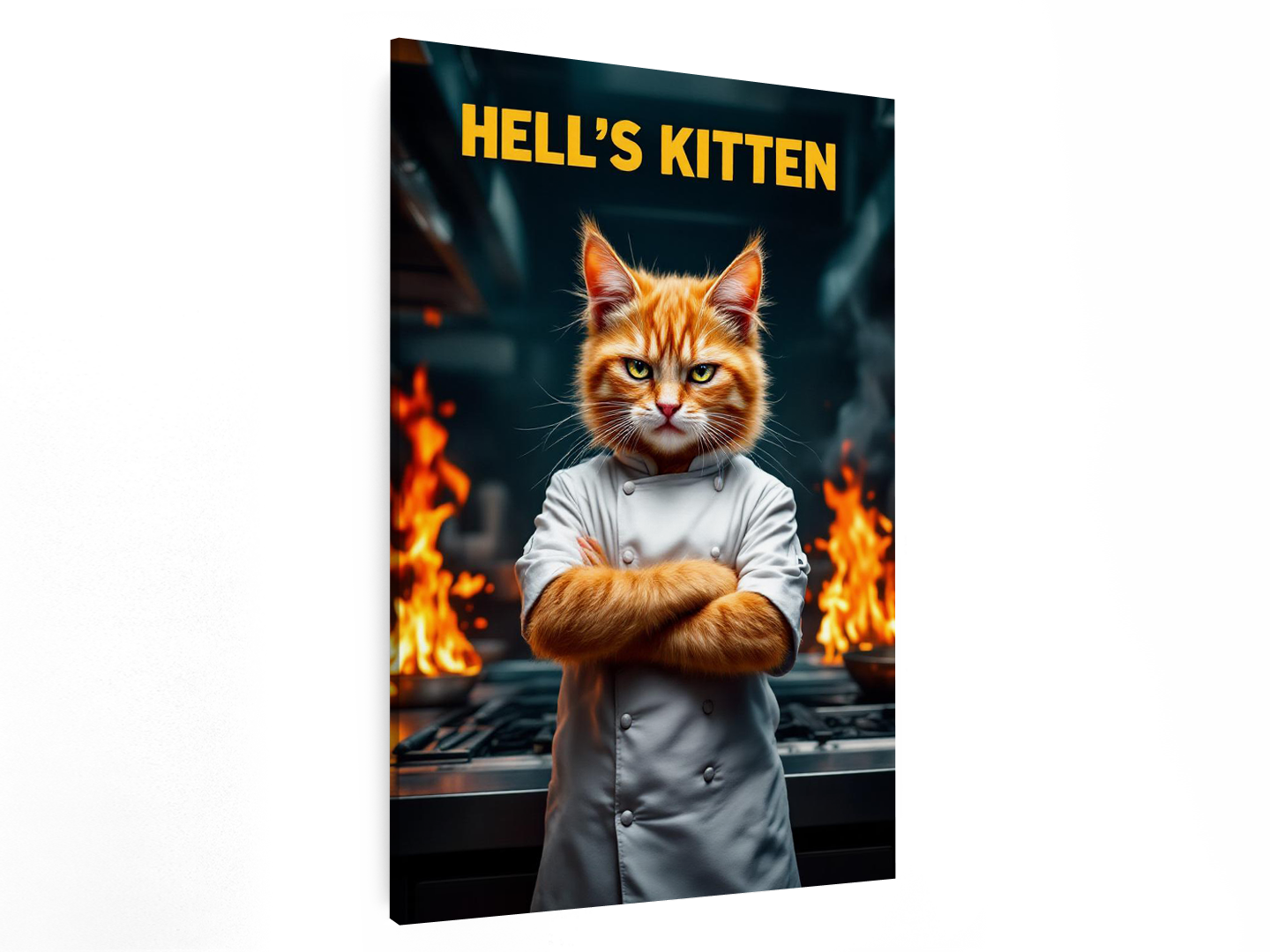 Een parodie poster geïnspireerd op Hell’s Kitchen. Een woest oranje kitten dat op Gordon Ramsay lijkt, maar geen directe kopie is, staat rechtop als een chef-kok, met de armen over elkaar in een zelfverzekerde en intimiderende pose. Het kitten heeft een scherpe, intense blik, expressieve wenkbrauwen, een licht geïrriteerde uitdrukking, en een sterke, dramatische persoonlijkheid.