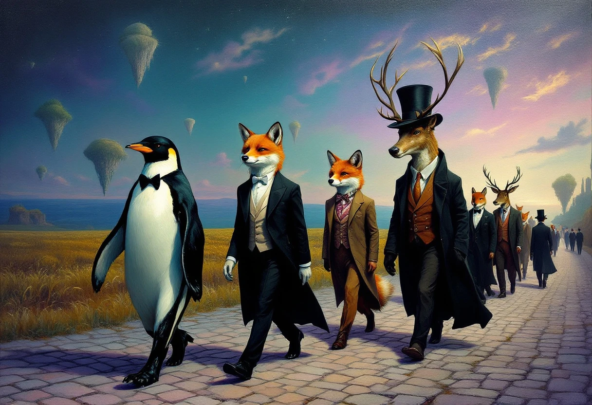 A surrealistic oil painting of animals walking like people in fancy clothing