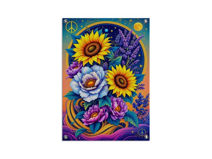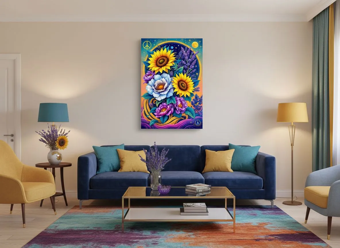 Bij iedere afbeelding benoemen wij de prompt waarmee wij dit design hebben gegenereerd. Zo kun je eenvoudig aanpassingen maken die jouw visie uniek maken en op de pagina 'Maak jouw wanddecoratie' zelf een design creeren dat niemand anders heeft!