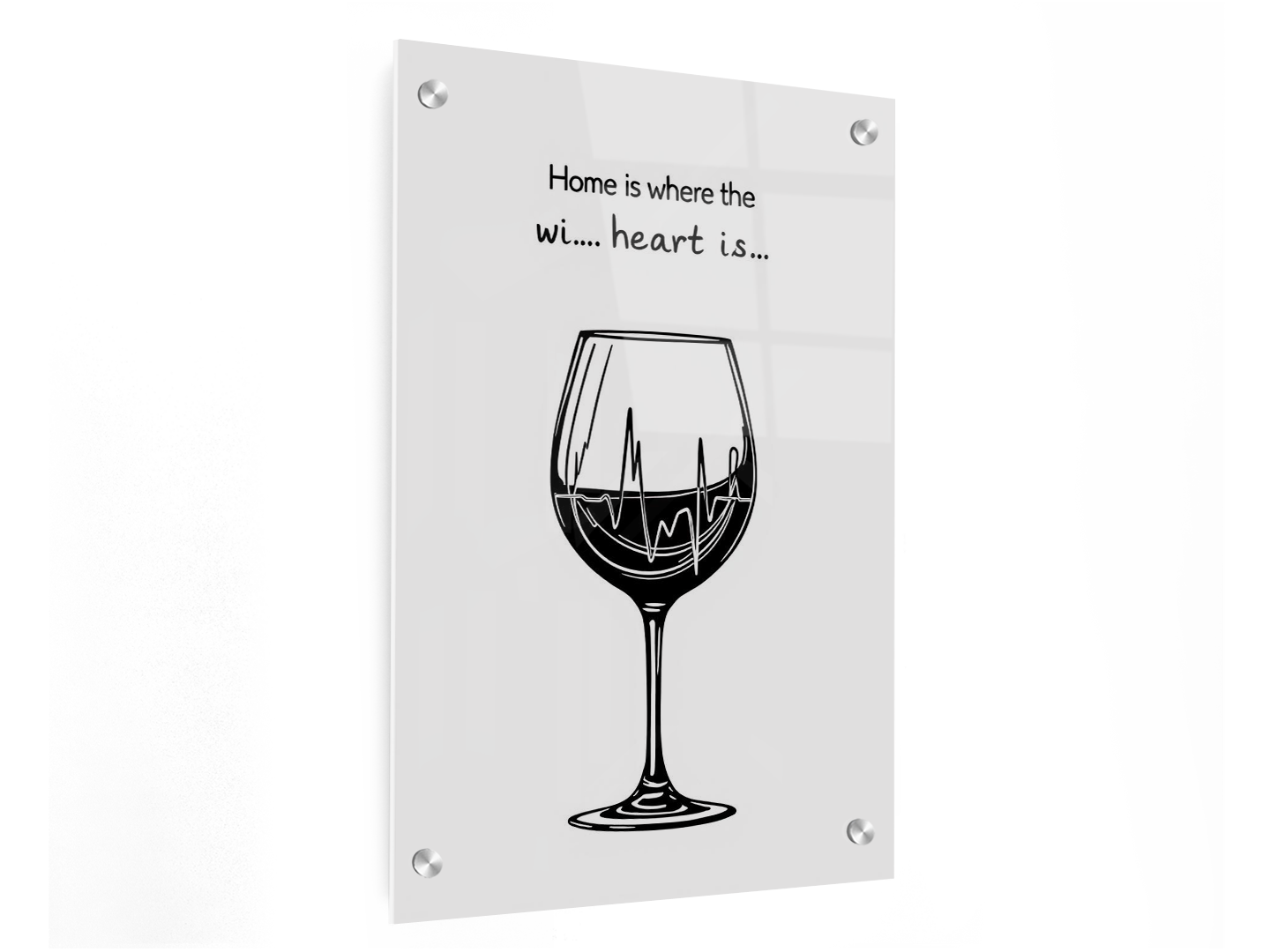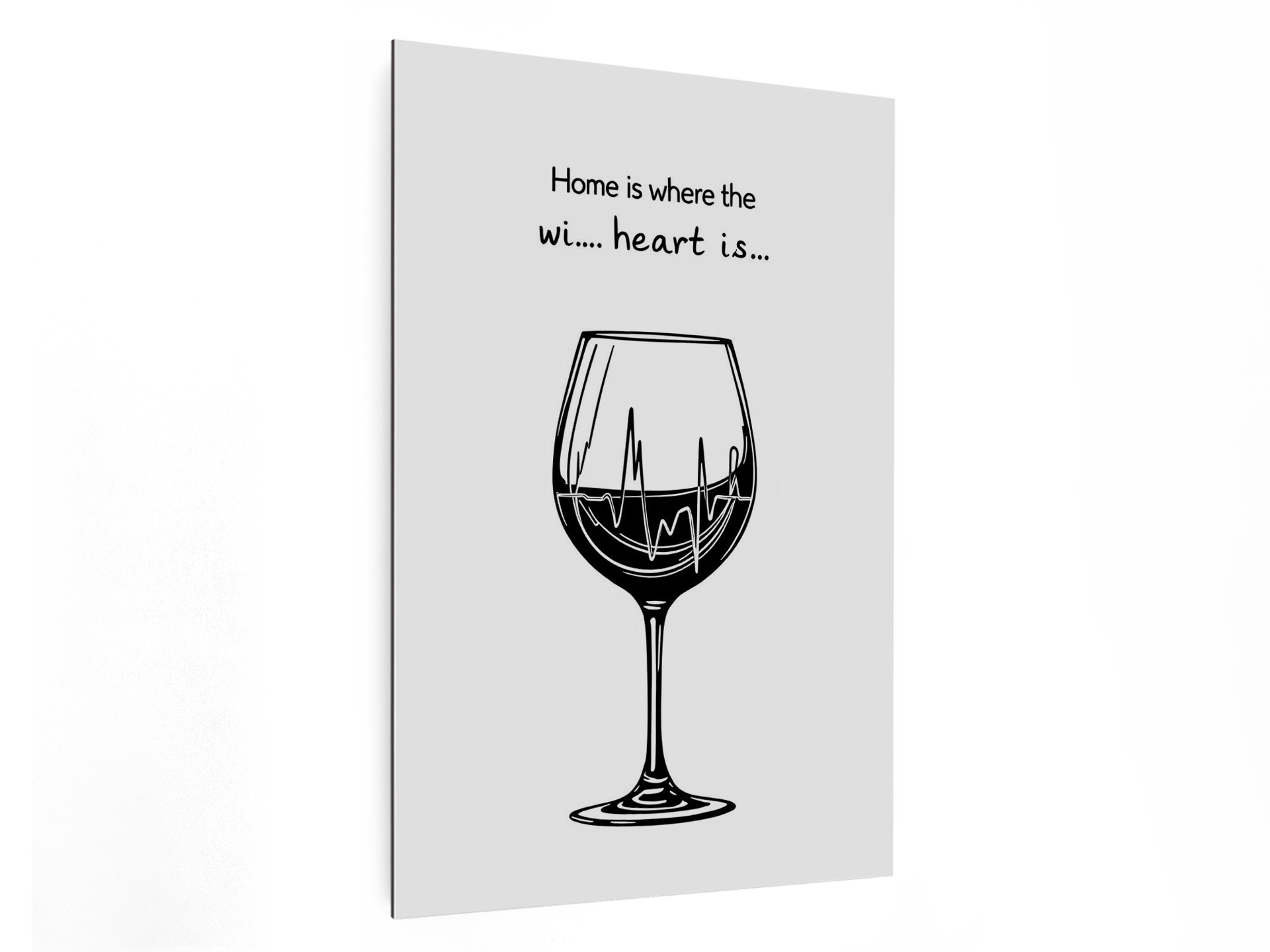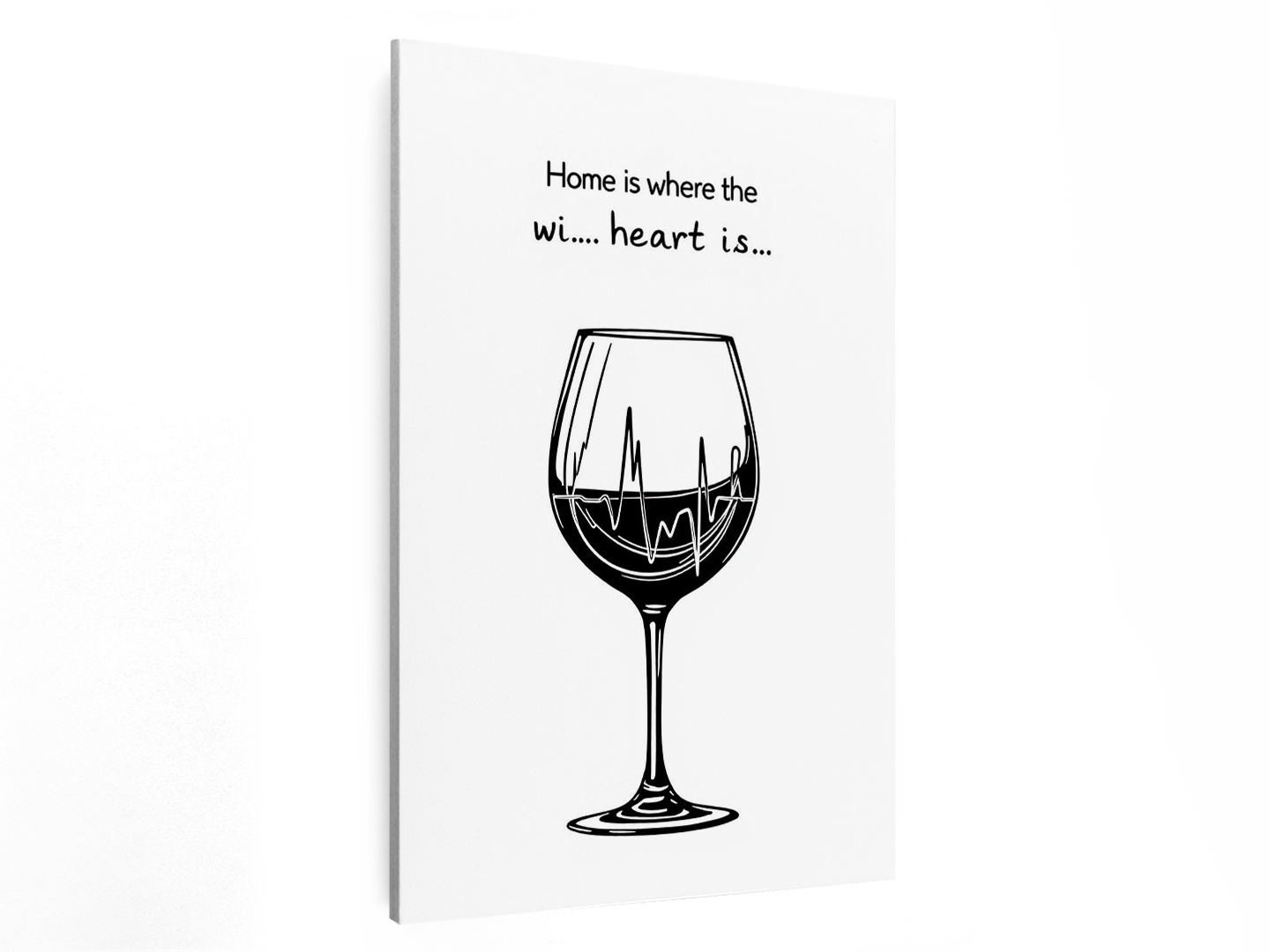 Een line art design van een hartslag lijn met een glas wijn er in verweven, simplistisch en minimalistisch modern design, zwart/wit met witte achtergrond, met de tekst: ´Home is where the wi… heart is´ boven de afbeelding.