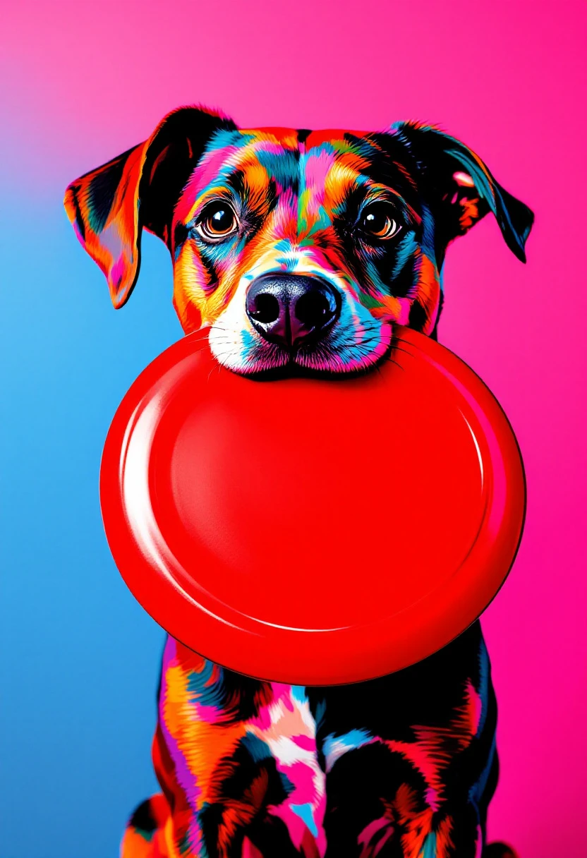 Een levendig pop-artportret van een hond die een frisbee in zijn bek houdt, in de kunststijl van Andy Warhol