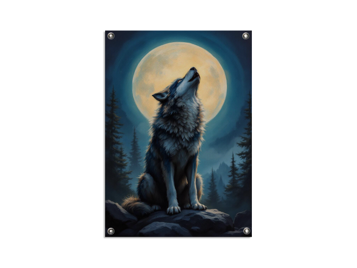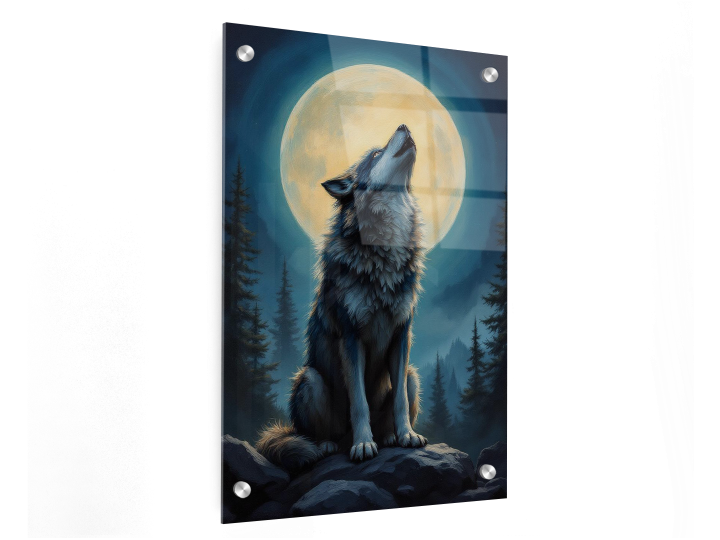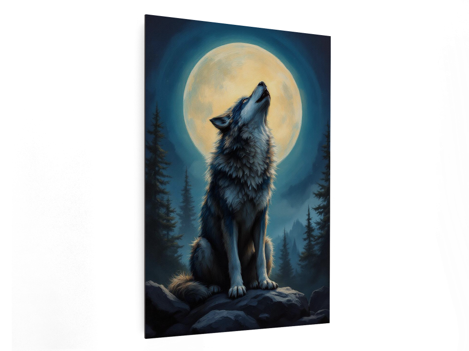 Een episch, levendig en dynamisch olieverfschilderij van een wolf, met een volle maan op de achtergrond, geschilderd met dikke, gelaagde impasto-verf.