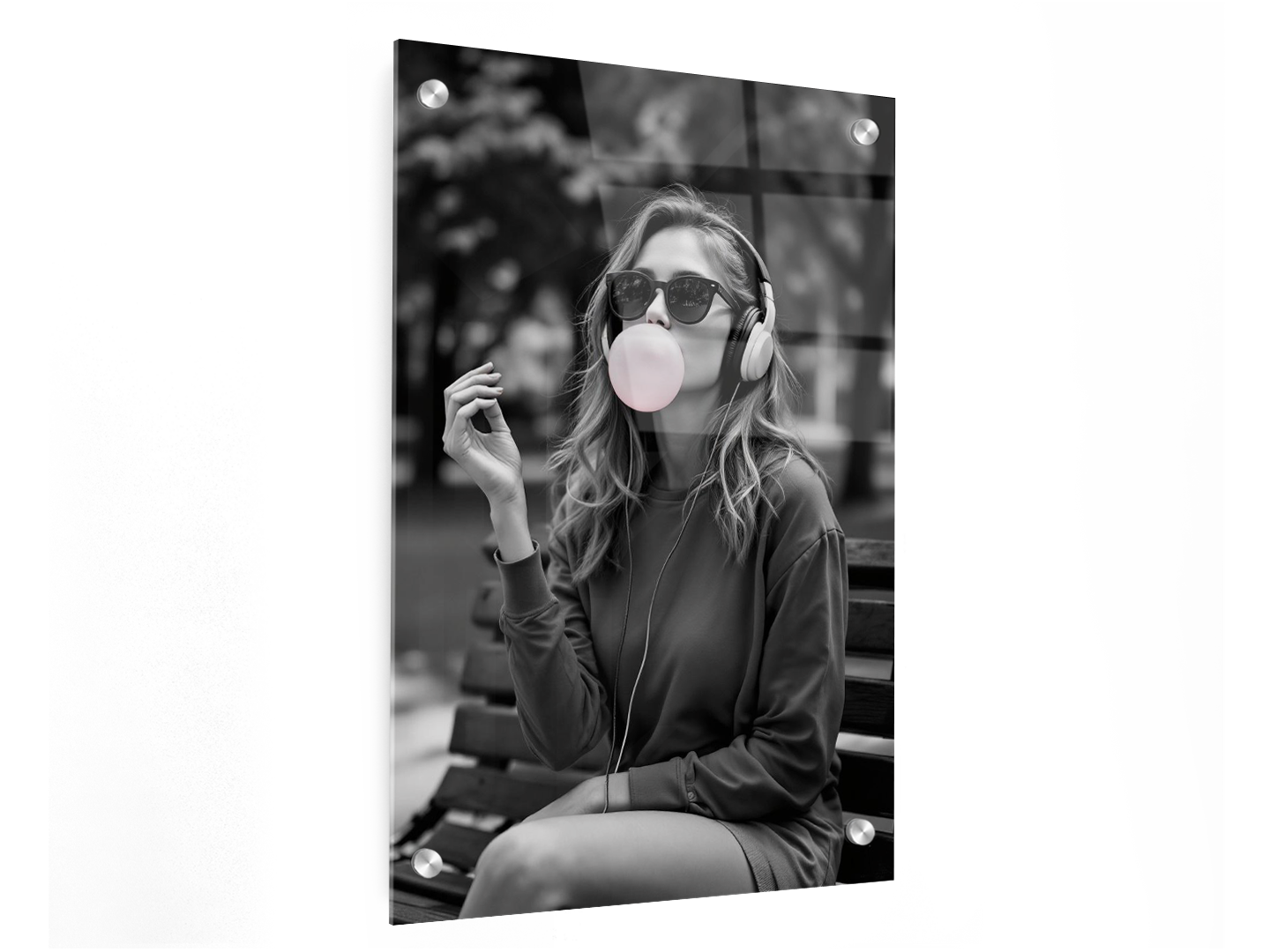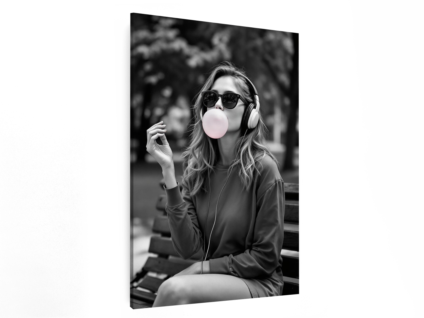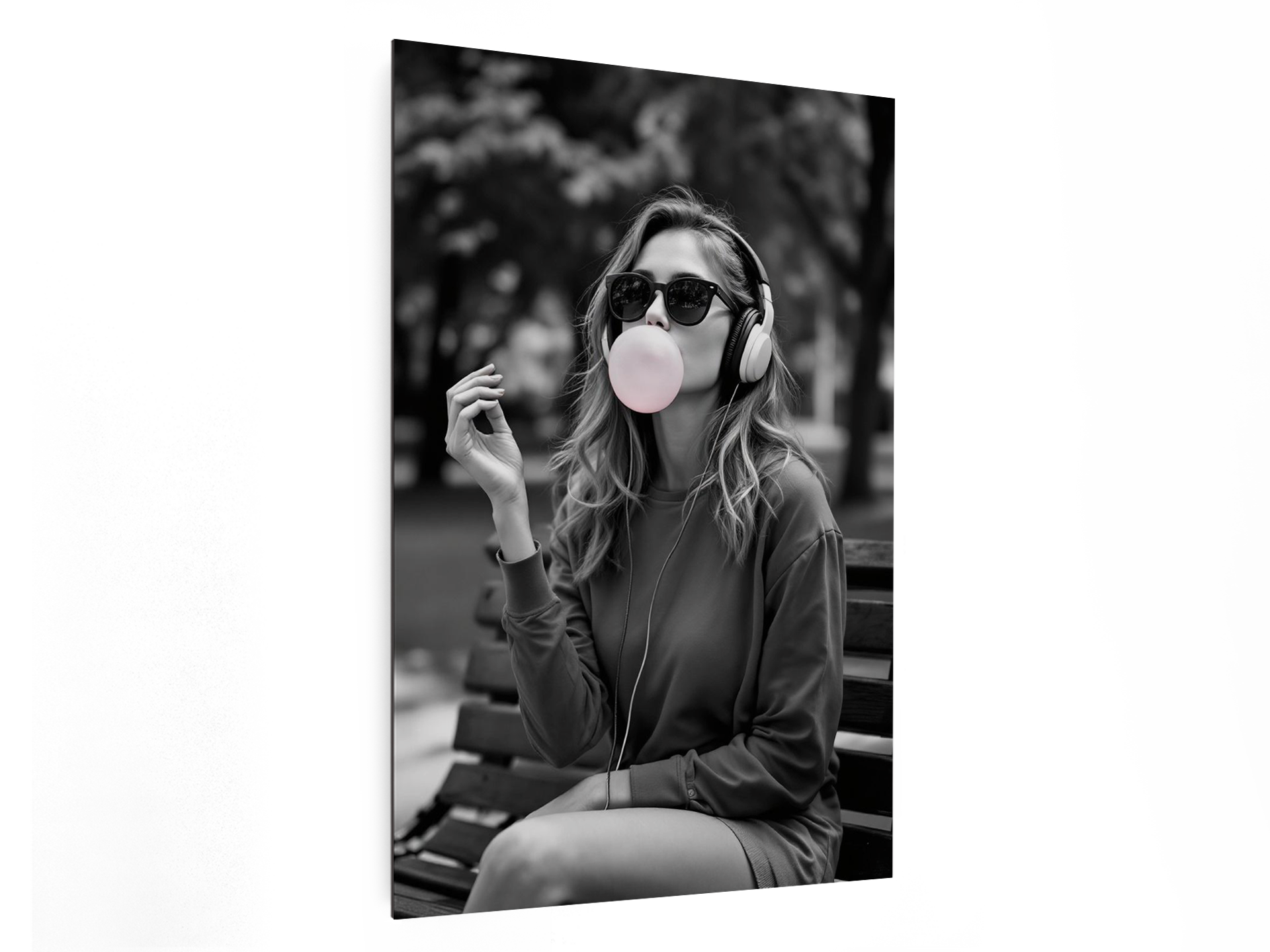 Een professionele zwart-witfoto van een mooie vrouw die op een parkbankje zit, een zonnebril en koptelefoon draagt ​​en een kauwgombal uit haar mond blaast, met waanzinnige details en correcte anatomie.
