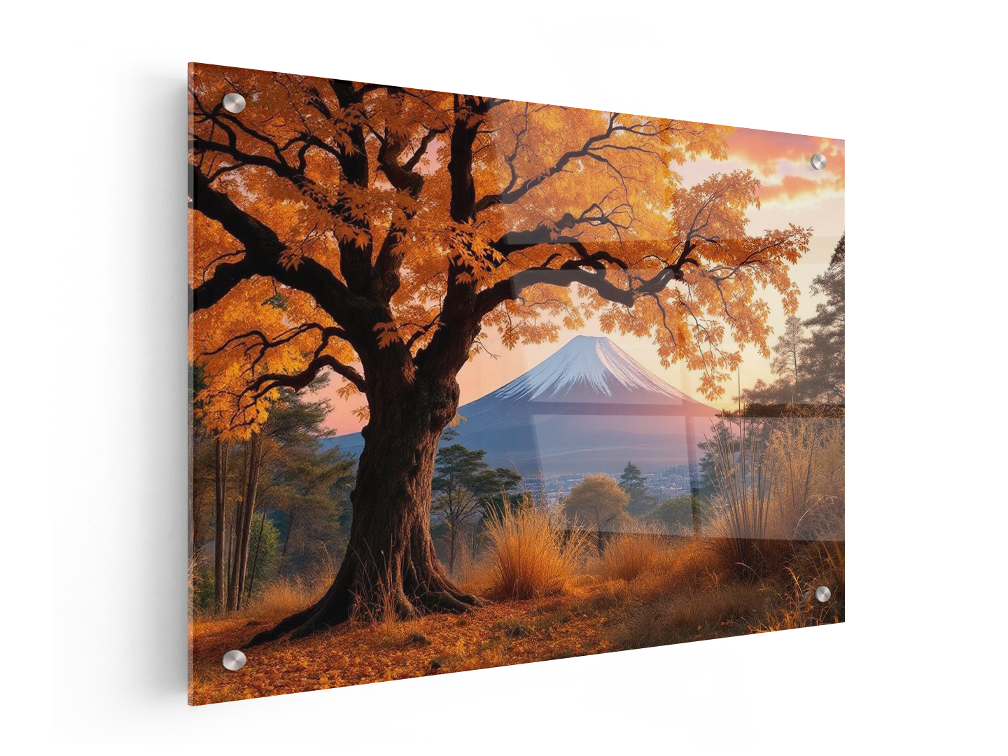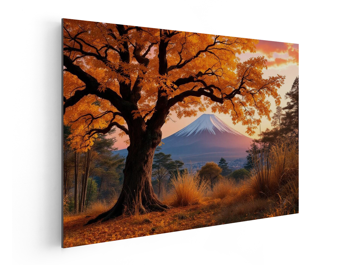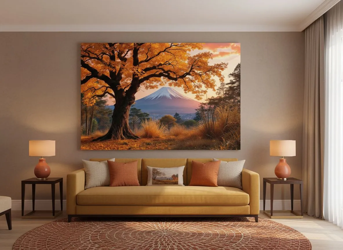 Een prachtig en betoverend Japans landschap, met een grote boom met gele bladeren op de voorgrond, omringd door andere bomen, met Mount Fuji in de achtergrond en een rode zonsopkomst die net achter de berging zichtbaar is.