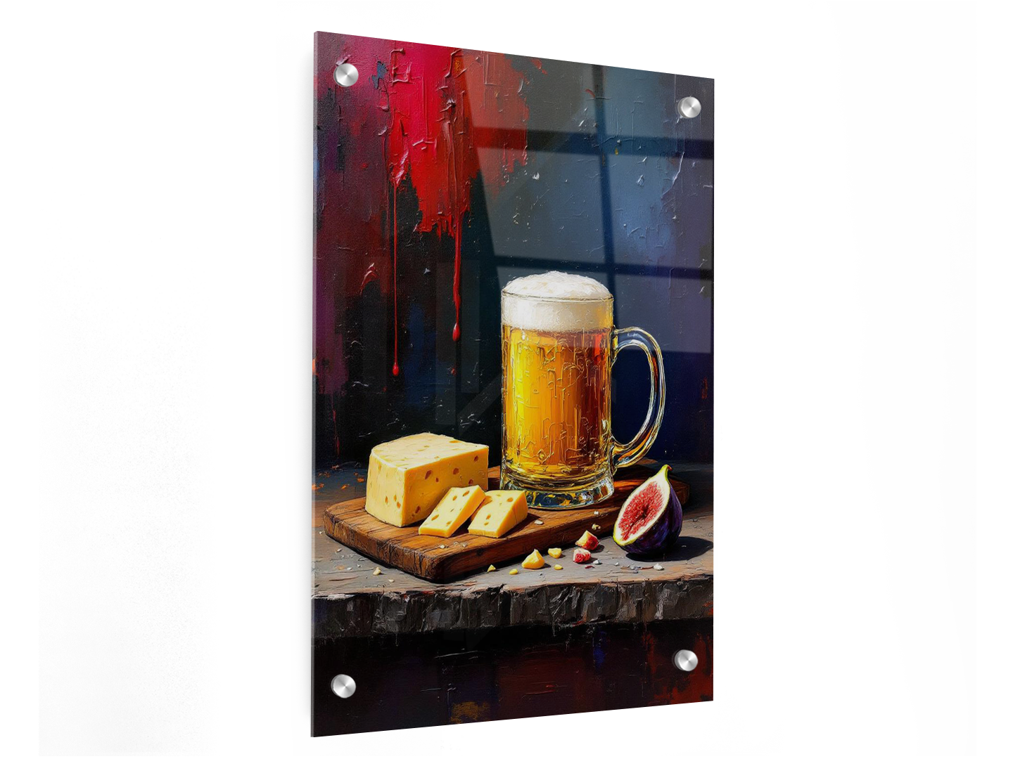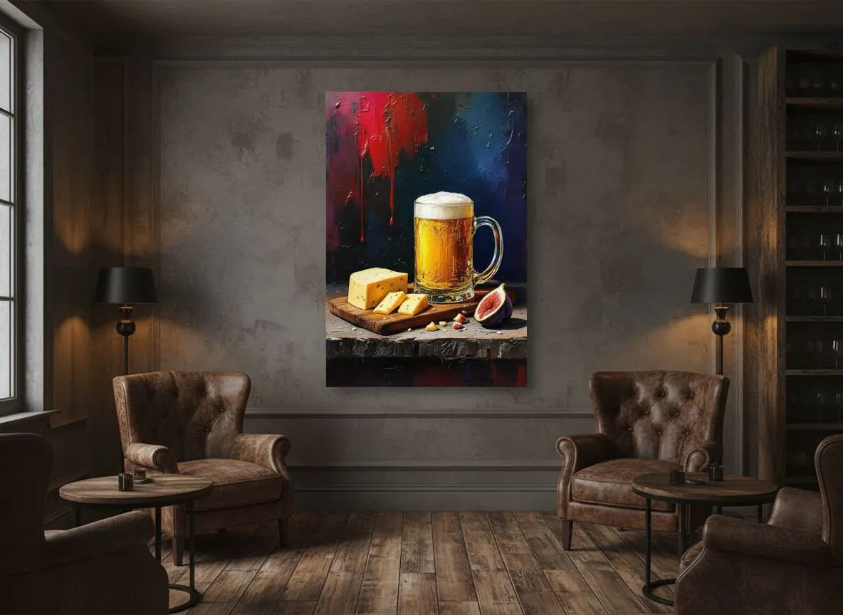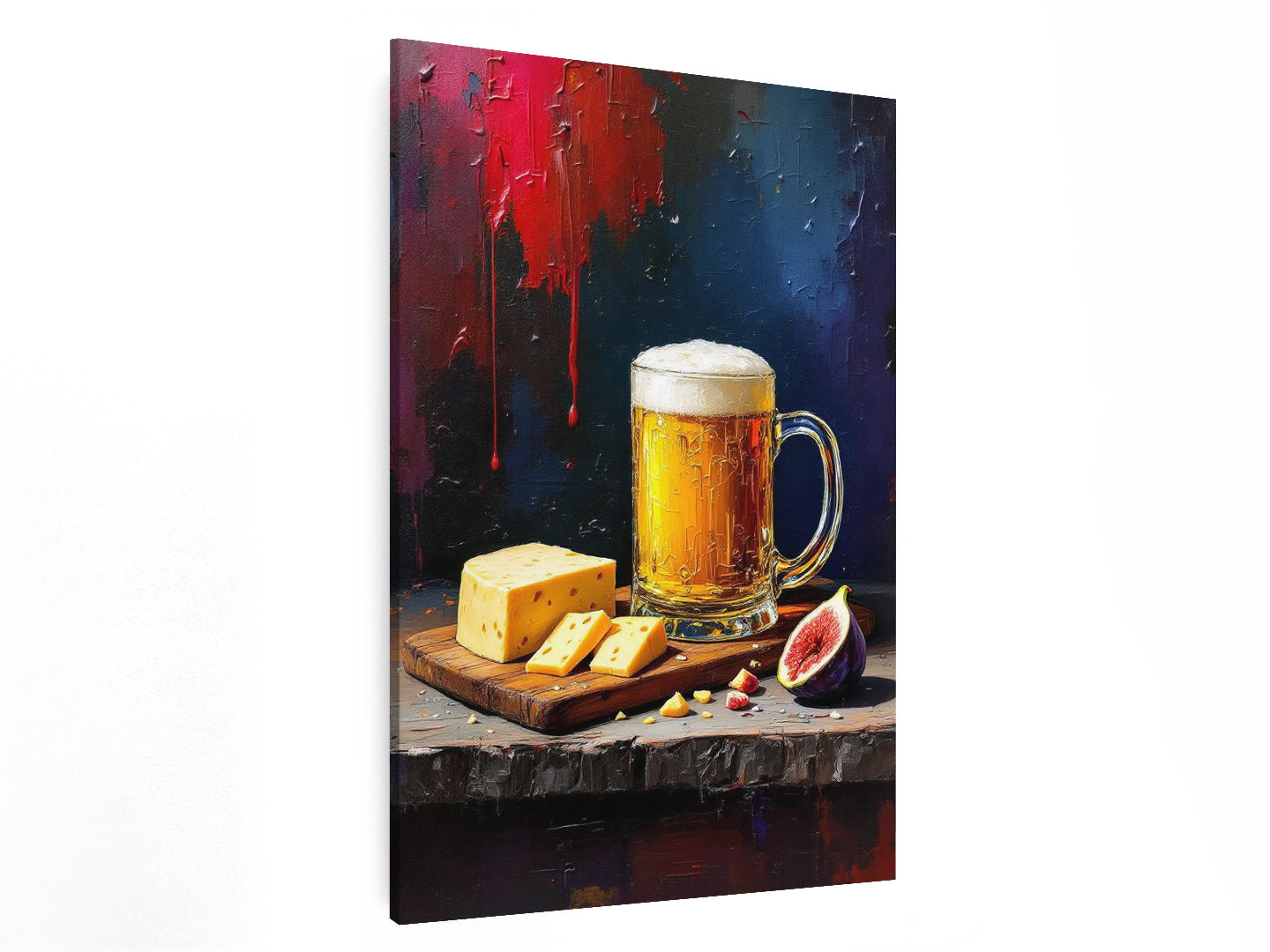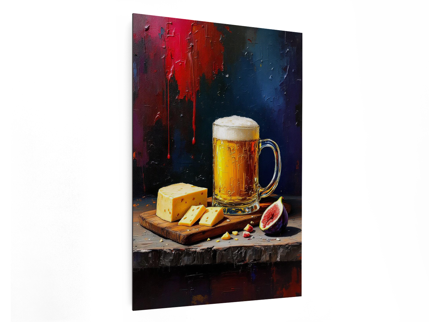 Een abstract olieverfschilderij van een lekker en smakelijk uitziend biertje met een mooie gouden kleur. Daarnaast ligt een houten snijplank met luxe kazen en een doorgesneden vijg, met een zwarte, rode en paarse achtergrond, dikke penseelstreken en een grove verfstructuur.