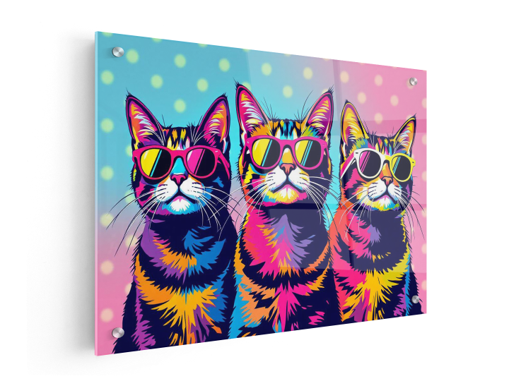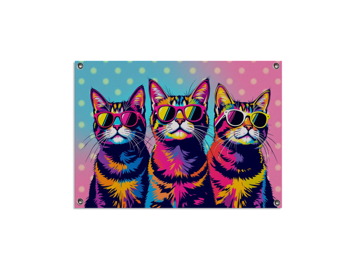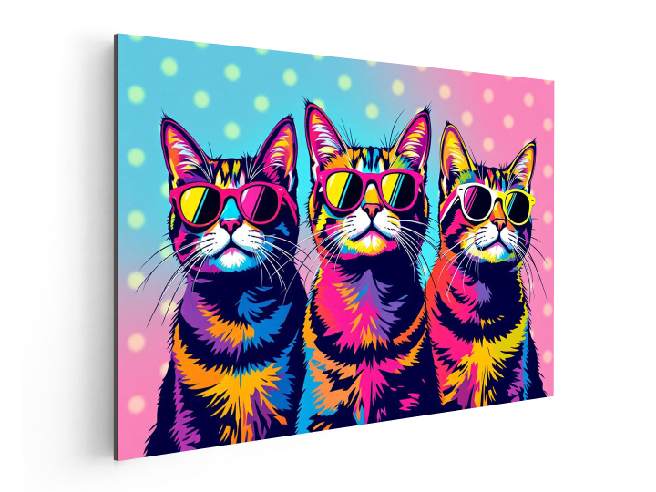 Een kleurrijk pop-art portret van drie katten, die alle drie een zonnebril dragen, met een polka dot achtergrond, met geweldige details en hoge kwaliteit.