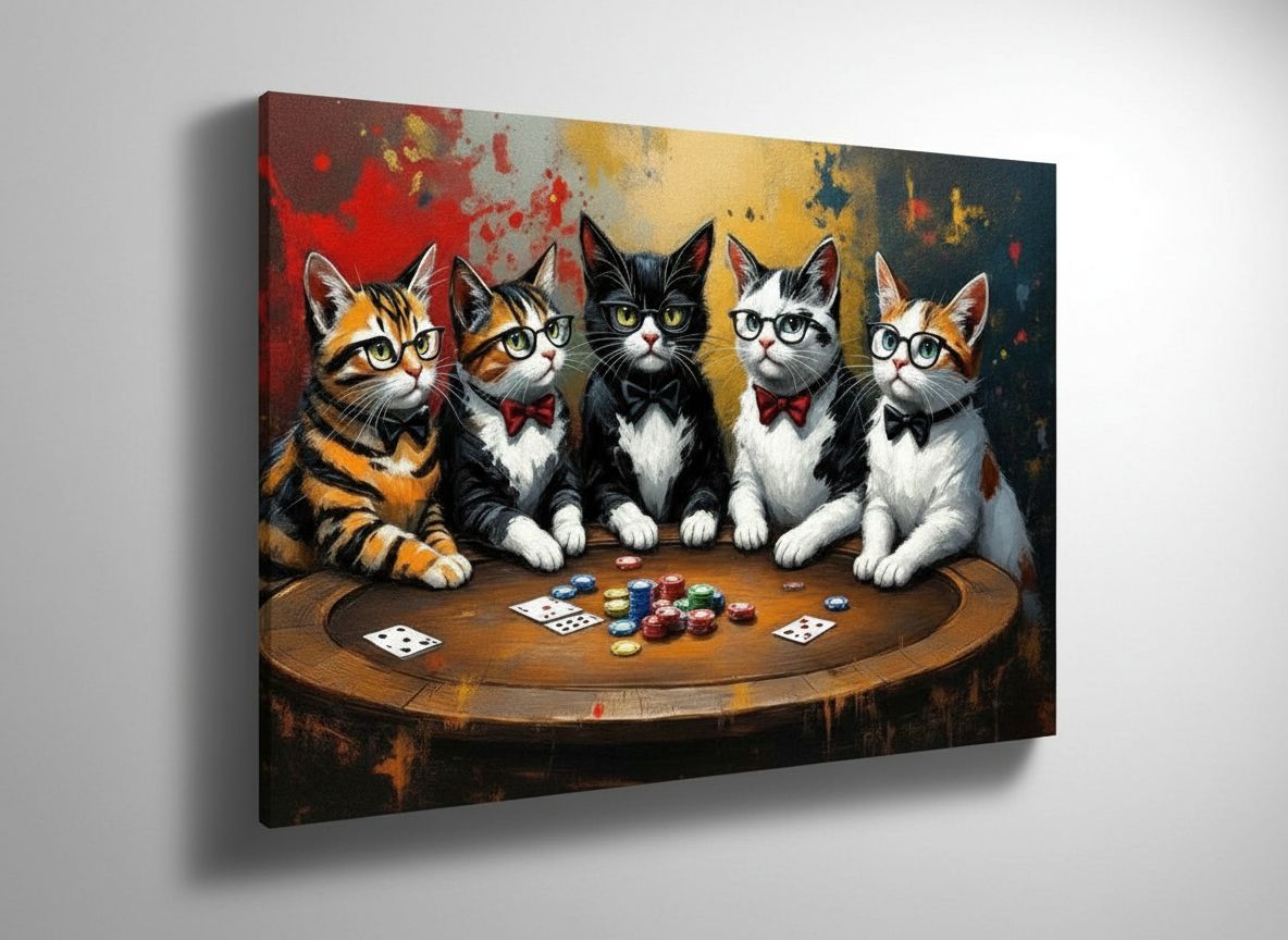 Een abstract olieverfschilderij van vijf katten die poker aan het spelen zijn met elkaar, zittend aan een tafel, iedere kat heeft zijn eigen kleurenpatroon, met geweldige details en in hoge kwaliteit.